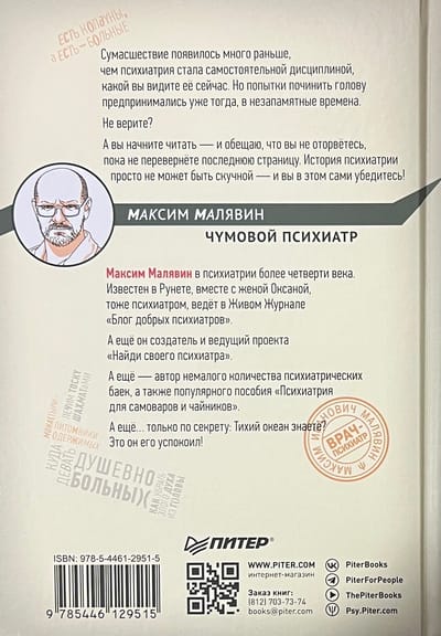Автор Максим Малявин в психиатрии более четверти века. Известен в Рунете, вместе с женой Оксаной, тоже психиатром, ведет в Живом Журнале «‎Блог добрых психиатров»‎. А ещё он создатель и ведущий проекта «‎Найди своего психиатра»‎. А ещё - автор немалого количества психиатрических баек, а также популярного пособия «‎Психиатрия для самоваров и чайников»‎. А ещё... только по секрету: Тихий океан знаете? Это он его успокоил.