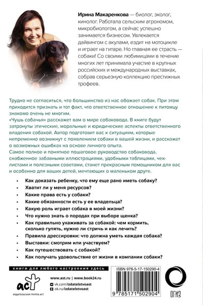 Ирина Макаренкова – биолог, эколог, кинолог. Работала сельским агрономом, микробиологом, а сейчас успешно занимается бизнесом. Увлекается дайвингом с акулами, ездит на мотоцикле и играет на гитаре. Но главная ее страсть – собаки! Со своими любимицами в течение многих лет принимала участие в крупных российских и международных выставках, собрав серьезную коллекцию престижных трофеев.