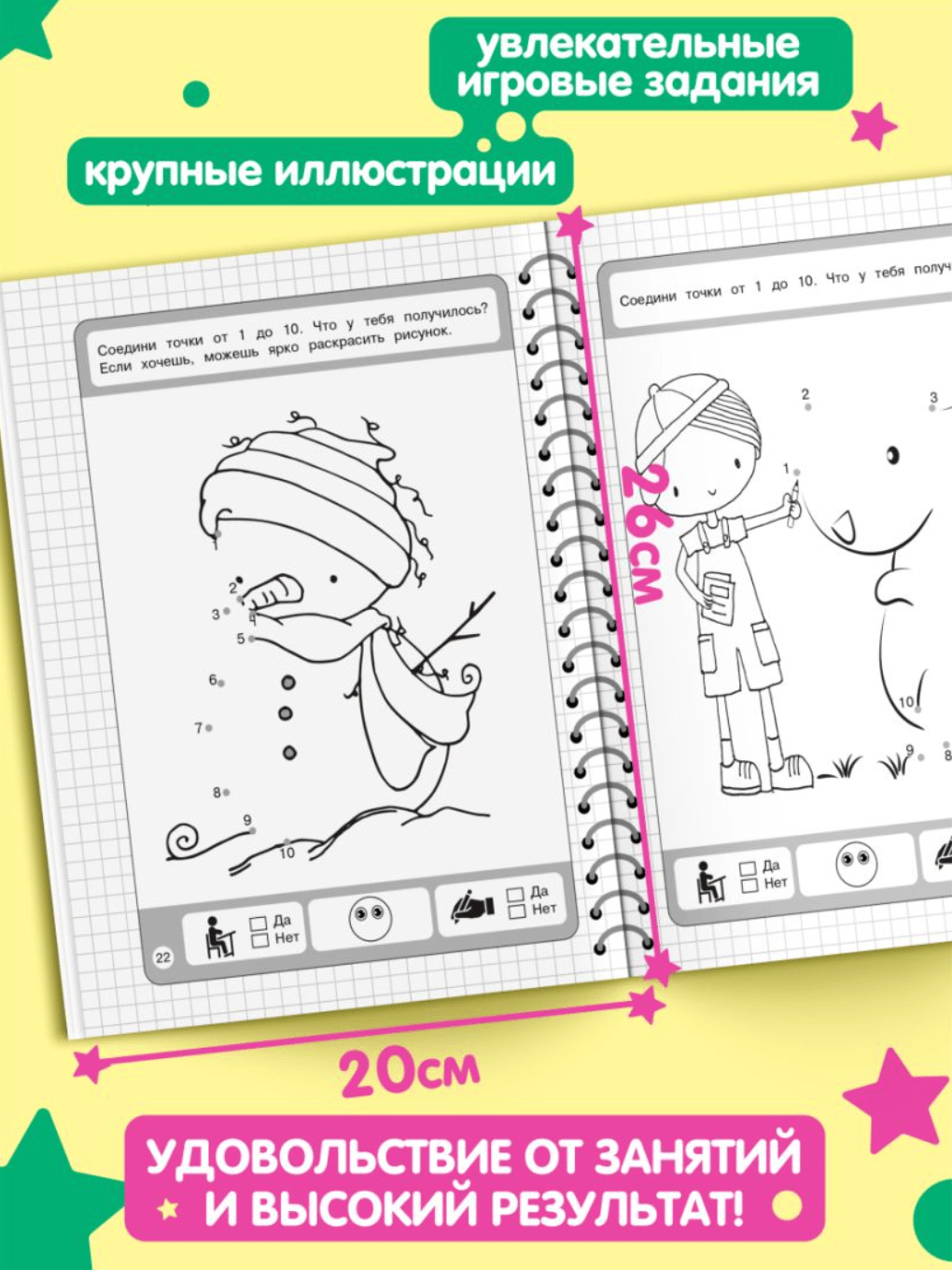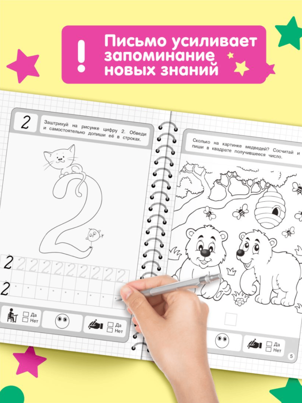 Книга издательства «Эксмо» — это настоящая находка для родителей, чьи дети скоро пойдут в 1 класс. Пособие, соответствующее ФГОС, четко структурировано и отлично подходит, чтобы начать знакомить ребенка с цифрами, так как первые знания дошкольник получает одновременно с развитием графических навыков. А написание цифр способствует их лучшему запоминанию. Крупные занимательные картинки будут мотивировать ребенка к занятиям. Занимаясь, дошкольник запомнит образ цифр, будет обводить их по контуру, писать в строчках самостоятельно и считать. Внизу каждой страницы имеются значки для оценки выполненных заданий. Поставив галочку в клетках «да» или «нет», ребенок сможет проконтролировать себя, а нарисовав ротик у смайлика вверх или вниз — оценить результат (хорошо / не очень хорошо). Постоянная работа с пособием поможет дошкольнику развить мелкую моторику, графические навыки, внимание, творческие способности, стать более усидчивым и аккуратным.