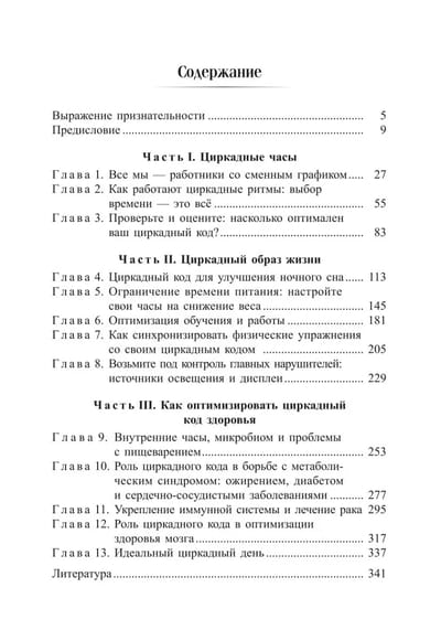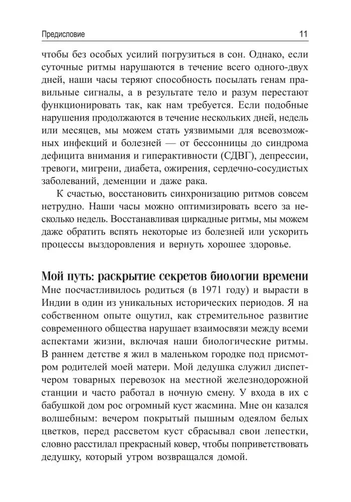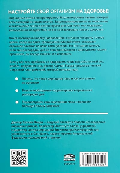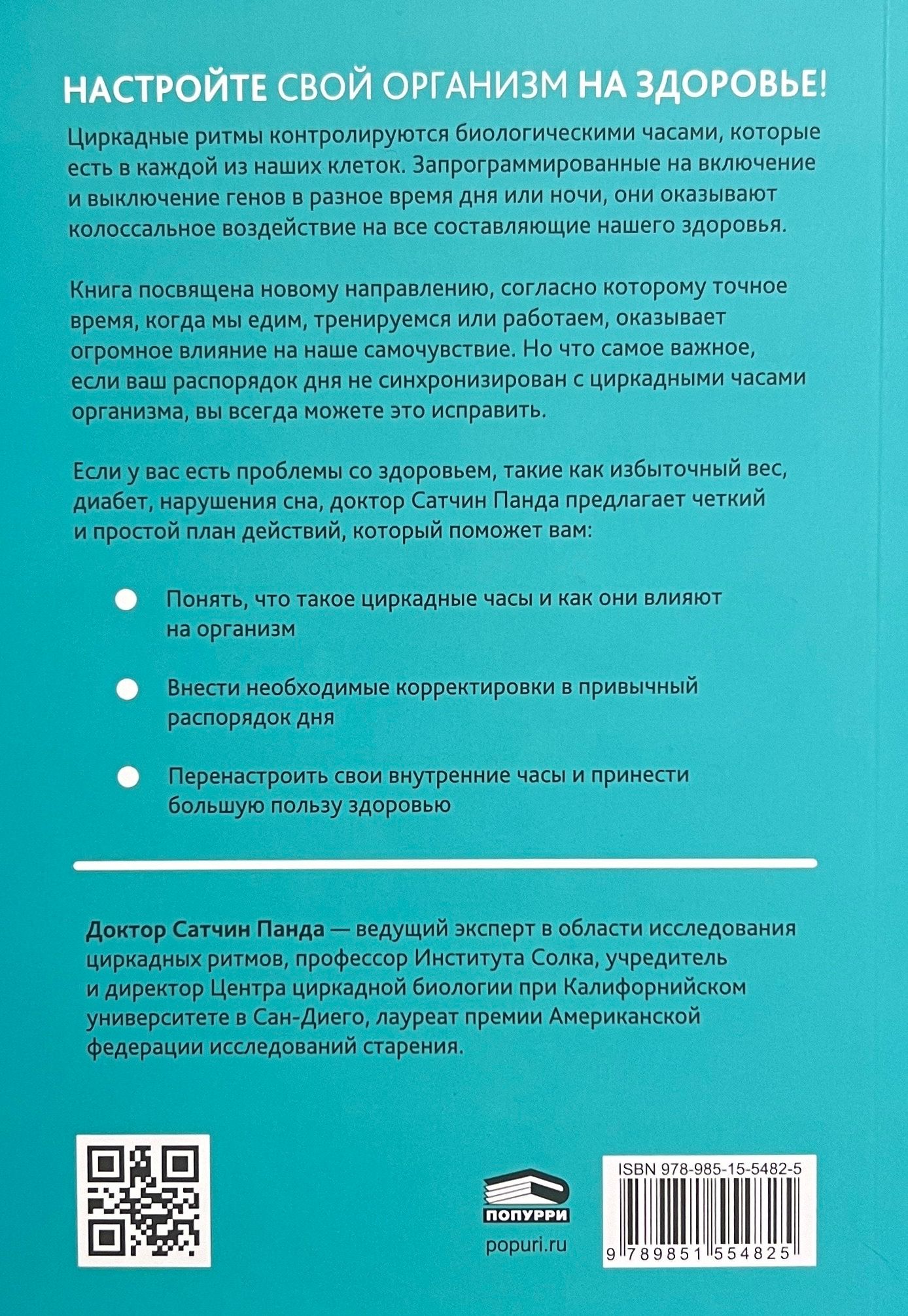 Циркадные ритмы контролируются биологическими часами, которые есть в каждой из наших клеток. Запрограммированные на включение и выключение генов в разное время дня или ночи, они оказывают колоссальное воздействие на все составляющие нашего здоровья. Книга посвящена новому направлению, согласно которому точное время, когда мы едим, тренируемся или работаем, оказывает огромное влияние на наше самочувствие. Но что самое важное, если ваш распорядок дня не синхронизирован с циркадными часами организма, вы всегда можете это исправить. Если у вас есть проблемы со здоровьем, такие как избыточный вес, диабет, нарушения сна, доктор Сатчин Панда предлагает четкий и простой план действий, который поможет вам: - Понять, что такое циркадные часы и как они влияют на организм - Внести необходимые корректировки в привычный распорядок дня - Перенастроить свои внутренние часы и принести большую пользу здоровью