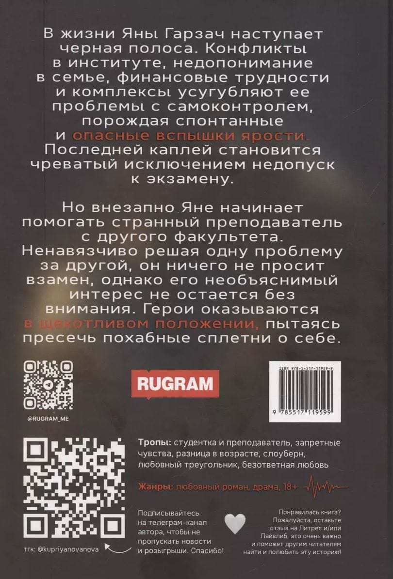 В жизни Яны Гарзач наступает черная полоса. Конфликты в институте, недопонимание в семье, финансовые трудности и комплексы усугубляют ее проблемы с самоконтролем, порождая спонтанные и опасные вспышки ярости. Последней каплей становится чреватый исключением недопуск к экзамену. Но внезапно Яне начинает помогать странный преподаватель с другого факультета. Ненавязчиво решая одну проблему за другой, он ничего не просит взамен, однако его необъяснимый интерес не остается без внимания. Герои оказываются в щекотливом положении, пытаясь пресечь похабные сплетни о себе.