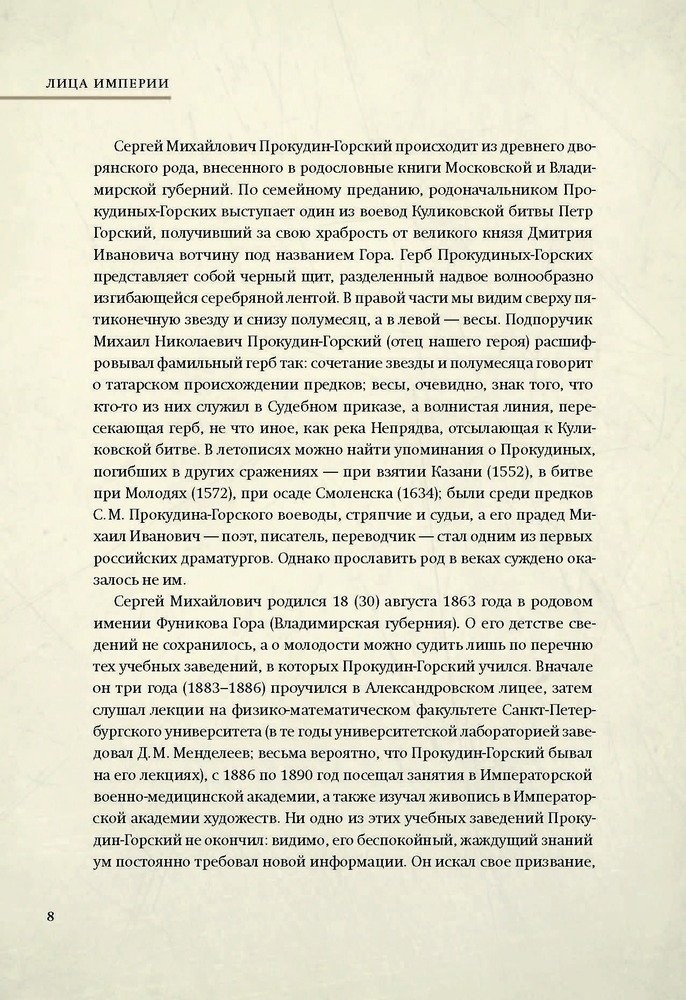 В альбоме мы можем увидеть лица этих людей — и не только тех, кто вошел в историю, но и простых, ничем не примечательных жителей городов и деревень. Возможно, именно такими были наши предки: носили яркие сарафаны, как русские крестьянки, или пестрые халаты, как мужчины на улицах Самарканда, смотрели на фотографа широко распахнутыми глазами, как крестьянские дети в Ясной Поляне, или недоверчиво щурились, как сарты в белых чалмах. Обо всех этих людях и пойдет речь в данной книге. Судьбы неудачливого бухарского эмира, великого русского писателя, монаха из отдаленного скита и рабочих с оружейного завода невидимой нитью связал один-единственный человек с фотоаппаратом — С. М. Прокудин-Горский.