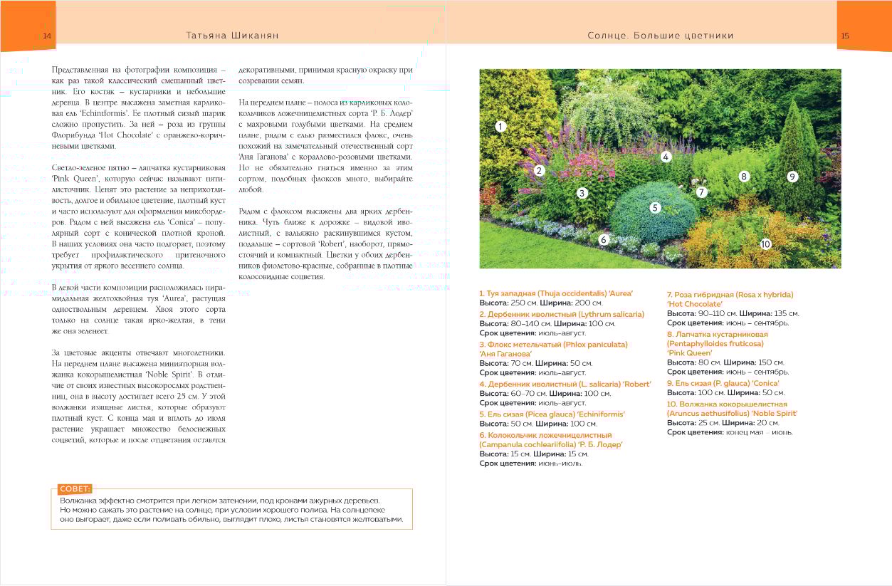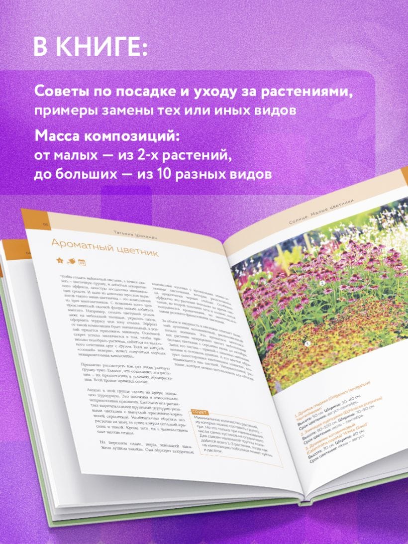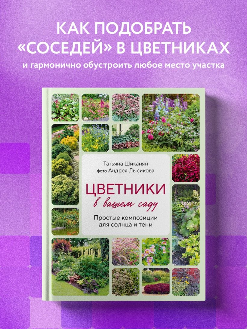 Необыкновенные схемы композиций в фотографиях известного ландшафтного фотографа Андрея Лысикова и авторские рекомендации Татьяны Шиканян помогут вам правильно подобрать «соседей» в цветниках и гармонично организовать пространство в любых условиях участка — на открытых солнечных местах, у стенки или забора, у воды и в окружении хвойных деревьев.