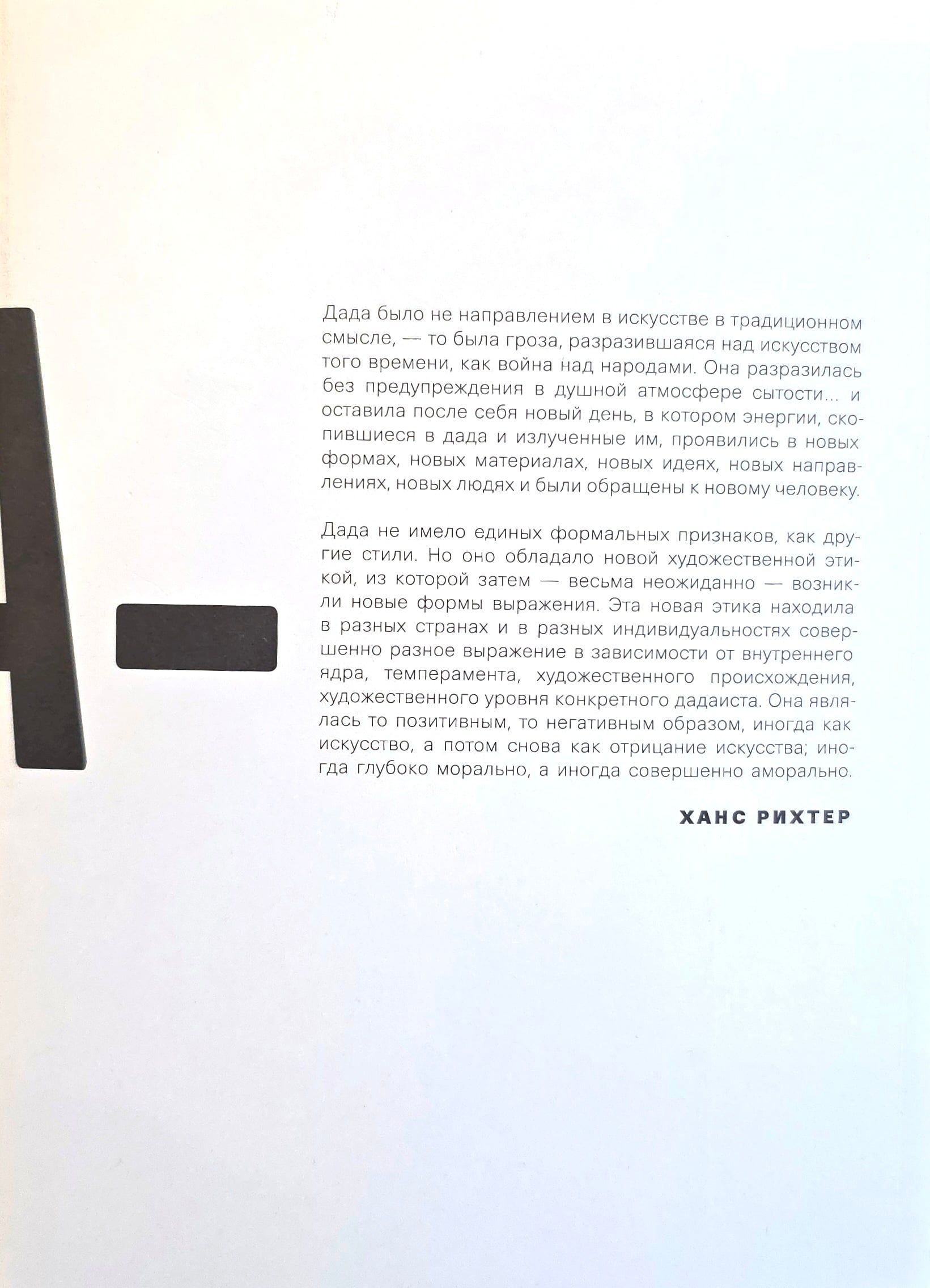 Одна из главных книг по истории, теории и философии дадаизма, написанная участником движения немецким художником и кинорежиссёром Хансом Рихтером (1888–1976). Она подробно рассказывает о разных вариантах этого антибуржуазного и анархического течения в искусстве, появившихся в первой четверти XX века в Цюрихе, Барселоне, Нью-Йорке, Берлине, Кёльне, Ганновере, Париже. Обширный научный комментарий, около 200 иллюстраций. Второе издание с дополненной библиографией по дадаизму.