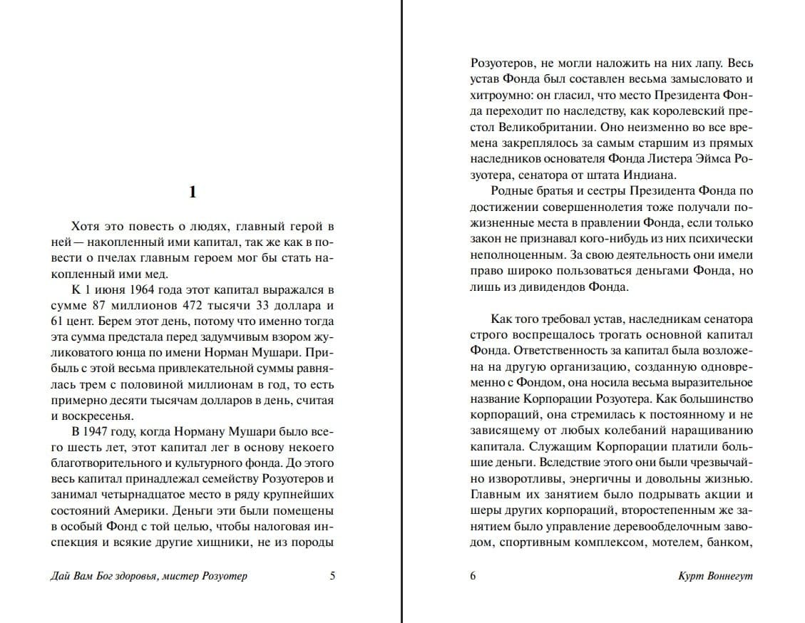 Что ни говори, неплохо быть мультимиллионером – устраивать благотворительные собрания, открывать торжественные мероприятия… да просто помогать нуждающимся. Только вот мистер Розуотер явно какой-то странный богач. Он помогает всем и каждому, то есть АБСОЛЮТНО всем, без разбора – только попроси! Впрочем, он раздает деньги даже тогда, когда его об этом не просят. Такое положение, конечно, нетерпимо, и семья, наняв ловкого юриста, пытается признать Розуотера психически неполноценным.