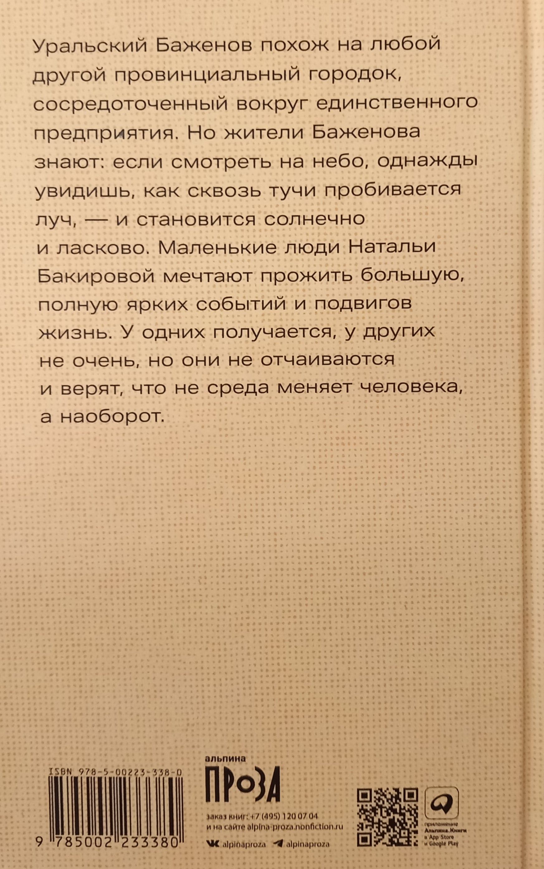 Уральский Баженов похож на любой другой провинциальный городок, сосредоточенный вокруг единственного предприятия. Но жители Баженова знают: если смотреть на небо, однажды увидишь, как сквозь тучи пробивается луч, — и становится солнечно и ласково. Маленькие люди Натальи Бакировой мечтают прожить большую, полную ярких событий и подвигов жизнь. У одних получается, у других не очень, но они не отчаиваются и верят, что не среда меняет человека, а наоборот
