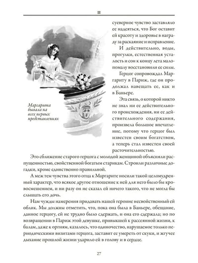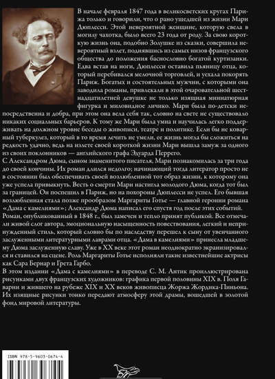 Знаменитый и нестареющий роман Александра Дюма-сына в переводе С. М. Антик о драматической любви между умирающей от чахотки парижской куртизанкой, прообразом которой была возлюбленная Дюма Мари Дюплесси, и ее пылким воздыхателем Арманом Дювалем в этом издании проиллюстрирован рисунками двух французских художников: графика первой половины XIX в. Поля Гаварни и жившего на рубеже XIX и XX веков живописца Жоржа Жордика-Пиньона.