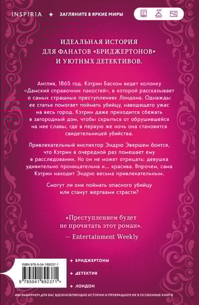 Англия, 1865 год. Кэтрин Баском ведет колонку «Дамский справочник пакостей», в которой рассказывает о самых страшных преступлениях Лондона. Однажды ее статья помогает поймать убийцу, наводящего ужас на весь город. Кэтрин даже приходится сбежать в загородный дом, чтобы скрыться от обрушившейся на нее славы, где в первую же ночь она становится свидетельницей убийства.
