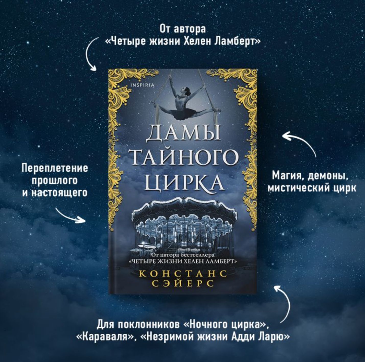 Новая книга от Констанс Сэйерс, автора бестселлера «Четыре жизни Хелен Ламберт»! Книга для поклонников «Ночного цирка» Эрин Моргенштерн, «Караваля» Стефани Гарбер и «Незримой жизни Адди Ларю» Виктории Шваб. Переплетение прошлого и настоящего, магия, демоны, мистический цирк и элегантная обложка, которую хочется видеть у себя на полке.