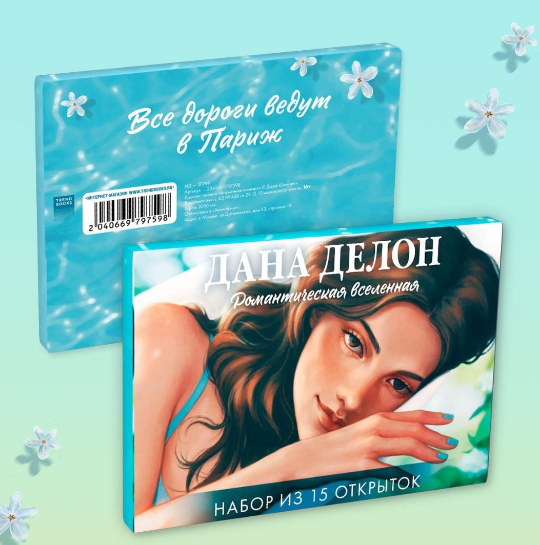 Набор открыток по романтической вселенной Даны Делон — идеальный подарок для поклонников творчества звезды янг эдалт. Погружаемся в атмосферу любимых романов вместе с эксклюзивным мерчом Трендбукс, украшаем книжные полки и шелестим страницами романтических бестселлеров Даны Делон.