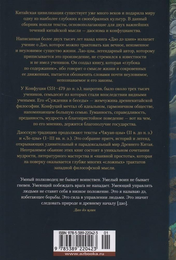Китайская цивилизация существует уже много веков и подарила миру одну из наиболее глубоких и своеобразных культур. В данный сборник вошли тексты, основополагающие для двух важнейших течений китайской мысли — даосизма и конфуцианства: «Дао дэ цзин», «Суждения и беседы Конфуция», «Чжуан-цзы» и «Ле-цзы». Публикация этих литературных памятников сопровождается статьями ученых Е. А. Торчинова, П. С. Попова и В. В. Малявина.
