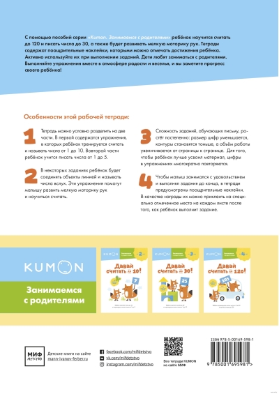 С помощью рабочей тетради "Kumon. Давай считать до 10!" ребенок: — будет развивать мелкую моторику рук, приклеивая наклейки и соединяя точки линиями; — запомнит, как выглядит и называется каждая цифра; — станет уверенно считать до 10; — научится писать числа до 5; — почувствует связь между числом и количеством объектов, которое оно обозначает. Задания в тетради даны по принципу от простого к сложному. Они разделены на два блока: 1. Cчет от 1 до 10 (№ 1-30). В этих упражнениях ребенок потренируется считать до 10 и называть числа вслух. Он будет: — проводить линии от числа к слову, которое его обозначает; — наклеивать наклейку с числом на правильное место на картинке; — соединять числа по порядку; — рисовать картинку, ведя линию через все числа. Благодаря этому малыш легко запомнит числа первого десятка. 2. Написание чисел от 1 до 5 (№ 31-53). Сначала ребенок потренируется проводить линии, проходя лабиринты, а затем начнет писать числа. Сложность заданий, обучающих письму, растет постепенно: размер цифр уменьшается, контуры становятся тоньше, а объем работы увеличивается от страницы к странице. Для кого эта книга Для детей от 2 лет, которые только начинают учиться считать.