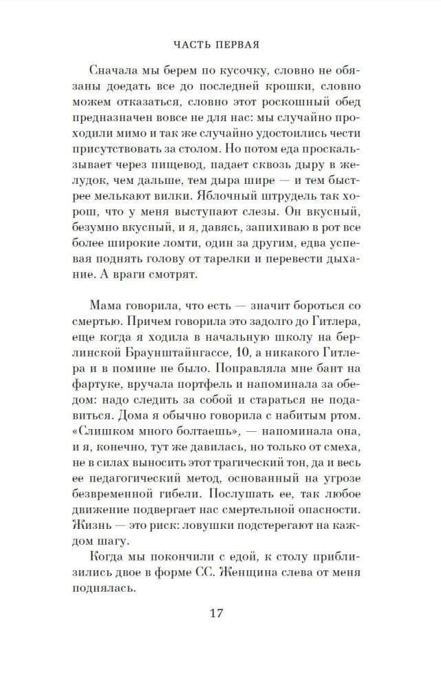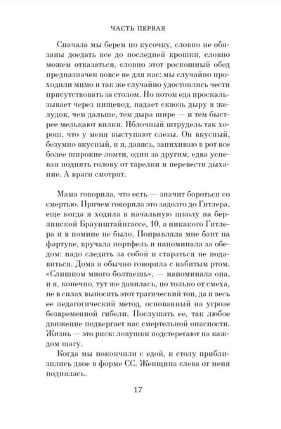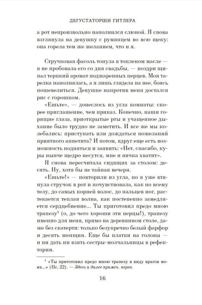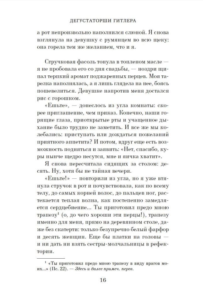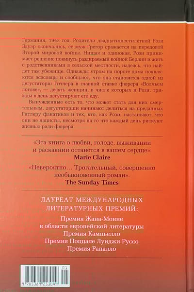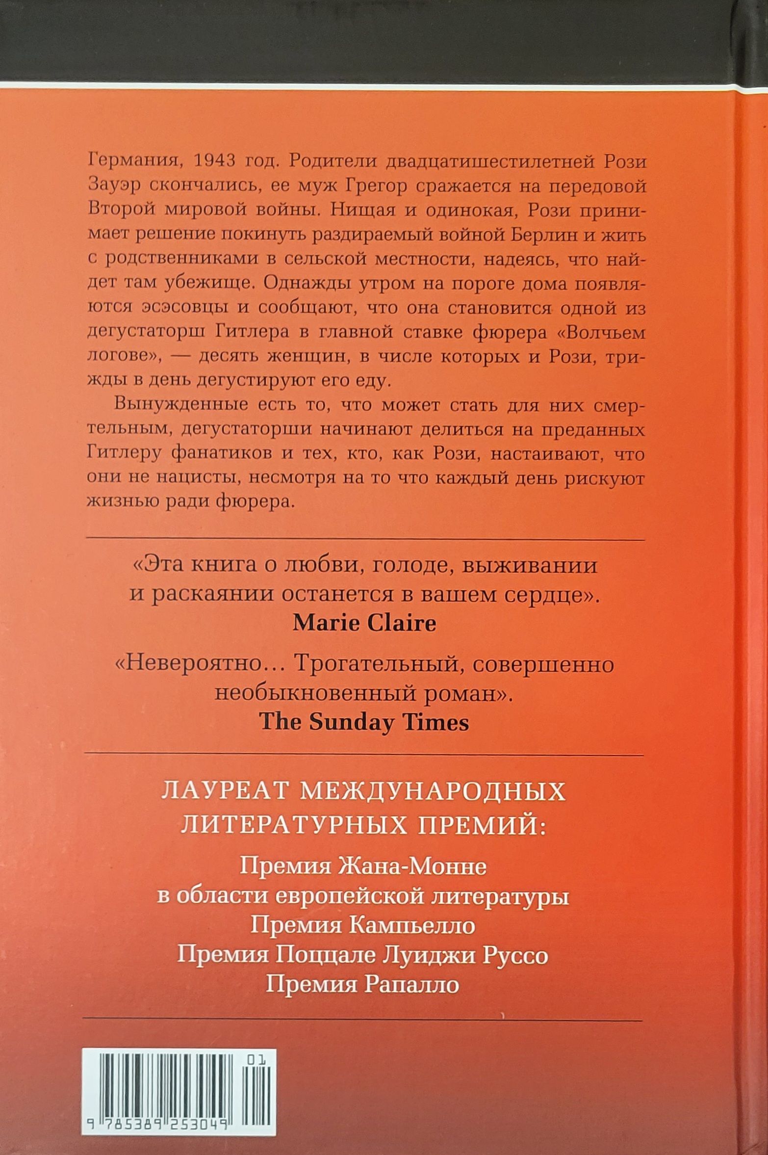 Международный бестселлер итальянской писательницы Розеллы Посторино, лауреата самых престижных литературных наград Италии: Stre ga, Campiello и Un autore l’Europa. Роман основывается на реальной истории — интервью, которое дала в 2012 году 95-летняя Марго Вёльк, единственная пережившая войну из пятнадцати девушек, которые в гитлеровской ставке Вольфсшанце («Волчье логово») пробовали еду, предназначенную для фюрера: тот патологически боялся, что его могут отравить. Для уроженки Берлина Розы Зауэр (под таким именем выведена Марго Вёльк в романе), оказавшейся в Восточной Пруссии случайно, эта служба давала возможность впервые за годы войны вдоволь поесть, но ценой каждого обеда могла стать смерть. Подобно «Чтецу» Бернхарда Шлинка, «Дегустаторши Гитлера» — не столько об ужасах войны, сколько о страхе и выборе. О том, можно ли оставаться над схваткой, служа воплощению мирового зла. На что можно и на что нельзя пойти, чтобы сохранить надежду на будущую жизнь, на возвращение мужа с фронта?..