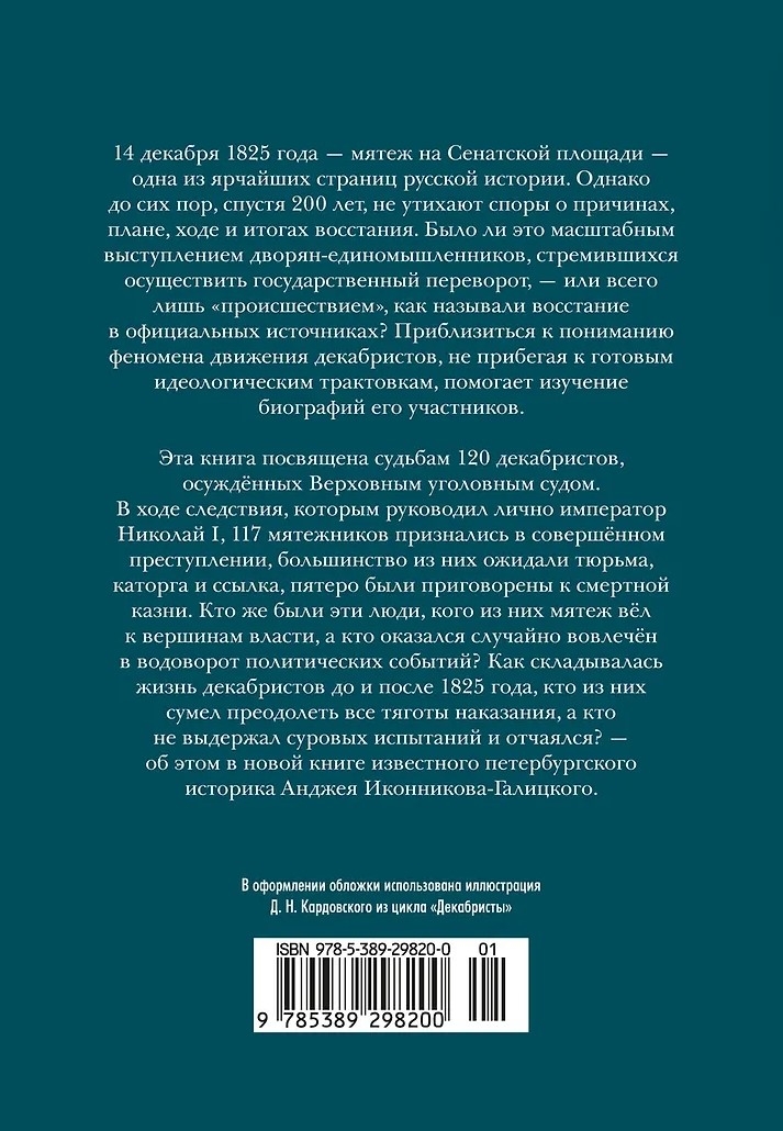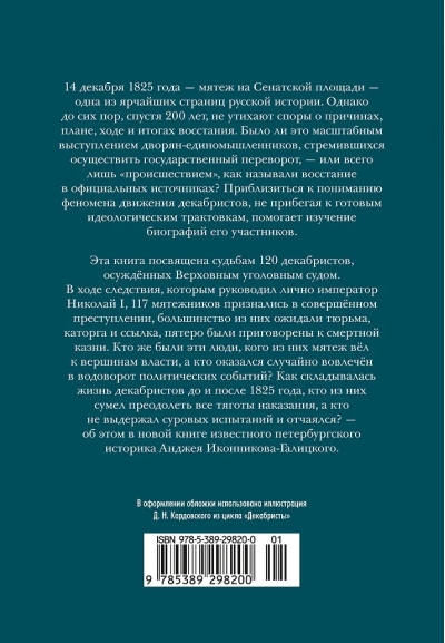 Эта книга посвящена судьбам 120 декабристов, осуждённых Верховным уголовным судом. В ходе следствия, которым руководил лично император Николай I, 117 мятежников признались в совершённом преступлении, большинство из них ожидали тюрьма, каторга и ссылка, пятеро были приговорены к смертной казни. Кто же были эти люди, кого из них мятеж вёл к вершинам власти, а кто оказался случайно вовлечён в водоворот политических событий? Как складывалась жизнь декабристов до и после 1825 года, кто из них сумел преодолеть все тяготы наказания, а кто не выдержал суровых испытаний и отчаялся? — об этом в новой книге известного петербургского историка Анджея Иконникова-Галицкого.