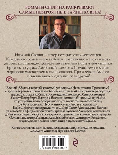 Книга состоит из пяти новелл, возвращающих читателя во времена молодого Лыкова и еще живого Благово. Совершенно жуткие загадочные происшествия от одного из самых популярных авторов исторических детективов, победителя премии «Русский детектив» Николая Свечина. Весной 1884 года темный, тяжелый лед сошел с Невы поздно. Промозглый сырой ветер начал прибивать к берегам и отмелям безобразные распухшие трупы. В этот раз их было просто чудовищно много. Однако полиция Санкт-Петербурга быстро и без тени сомнений находила причины: то утопление по неосторожности, то в алкогольном состоянии, то в беспамятстве. Несчастные случаи, что тут поделаешь… Вице-директор Департамента полиции Павел Афанасьевич Благово не согласен с официальной точкой зрения. Вместе с Алексеем Лыковым он добивается разрешения на повторное вскрытие тела некоего трактирщика Осташкова, который в пьяном виде якобы свалился в реку. Результаты анализа воды в легких покойника ошеломляют Благово…