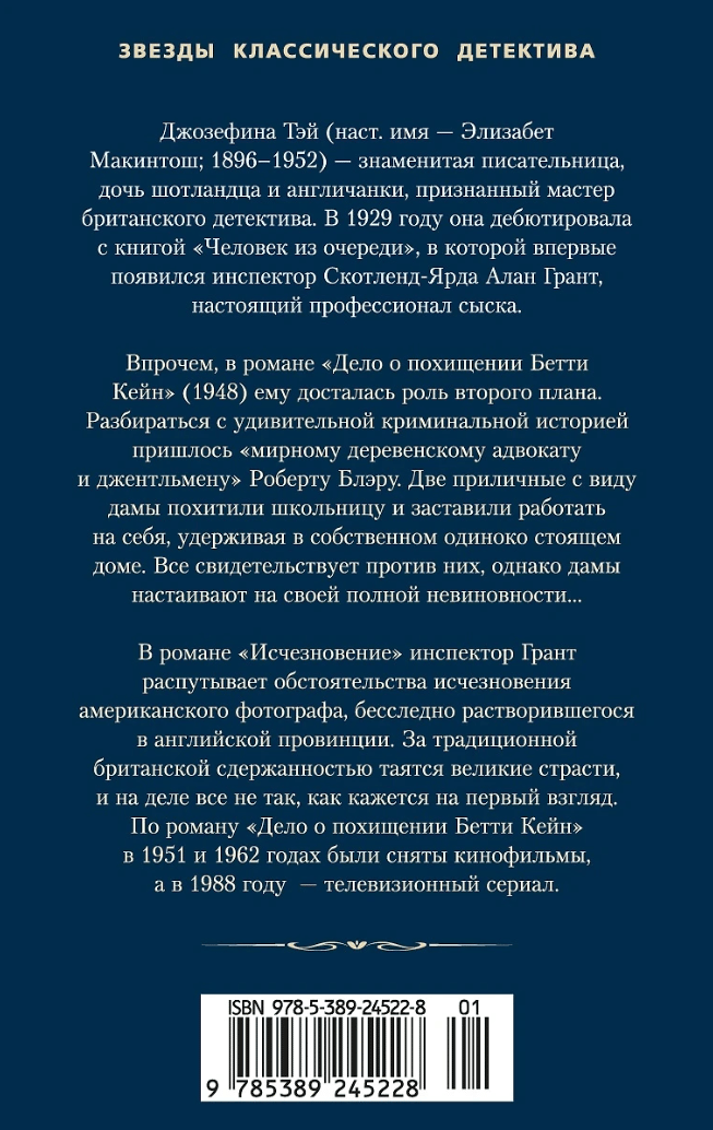 Джозефина Тэй (наст. имя — Элизабет Макинтош; 1896–1952) — знаменитая писательница, дочь шотландца и англичанки, признанный мастер британского детектива. В 1929 году она дебютировала с книгой «Человек из очереди», в которой впервые появился инспектор Скотленд-Ярда Алан Грант, настоящий профессионал сыска. Впрочем, в романе «Дело о похищении Бетти Кейн» (1948) ему досталась роль второго плана. Разбираться с удивительной криминальной историей пришлось «мирному деревенскому адвокату и джентльмену» Роберту Блэру. Две приличные с виду дамы похитили школьницу и заставили работать на себя, удерживая в собственном одиноко стоящем доме. Все свидетельствует против них, однако дамы настаивают на своей полной невиновности...