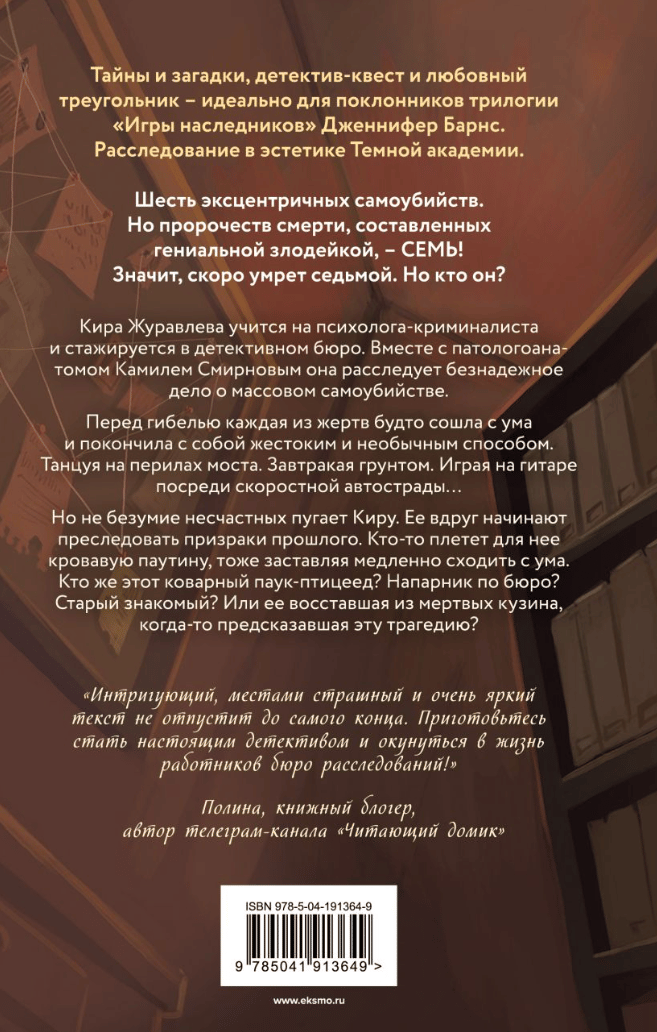 Но не безумие несчастных пугает Киру. Ее вдруг начинают преследовать призраки прошлого. Кто-то плетет для нее кровавую паутину, тоже заставляя медленно сходить с ума. Кто же этот коварный паук-птицеед? Напарник по бюро? Старый знакомый? Или ее восставшая из мертвых кузина, когда-то предсказавшая эту трагедию?