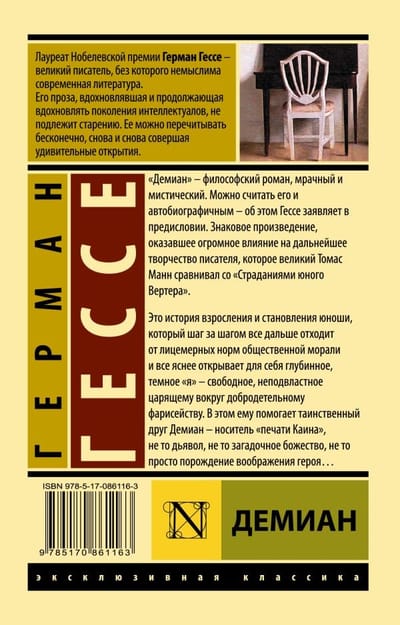 «Демиан» — философский роман, мрачный и мистический. Можно считать его и автобиографичным — об этом Гессе заявляет в предисловии. Знаковое произведение, оказавшее огромное влияние на дальнейшее творчество писателя, а великий Томас Манн сравнивал эту книгу со «Страданиями юного Вертера».