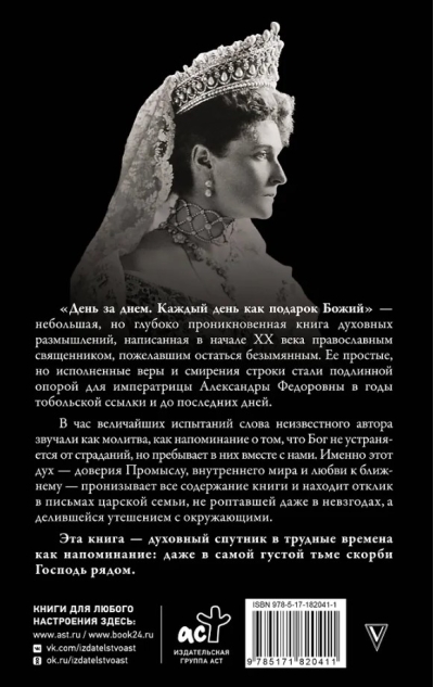 «День за днем. Каждый день как подарок Божий» — небольшая, но глубоко проникновенная книга духовных размышлений, написанная в начале XX века православным священником, пожелавшим остаться безымянным. Ее простые, но исполненные веры и смирения строки стали подлинной опорой для императрицы Александры Федоровны в годы тобольской ссылки и до последних дней.