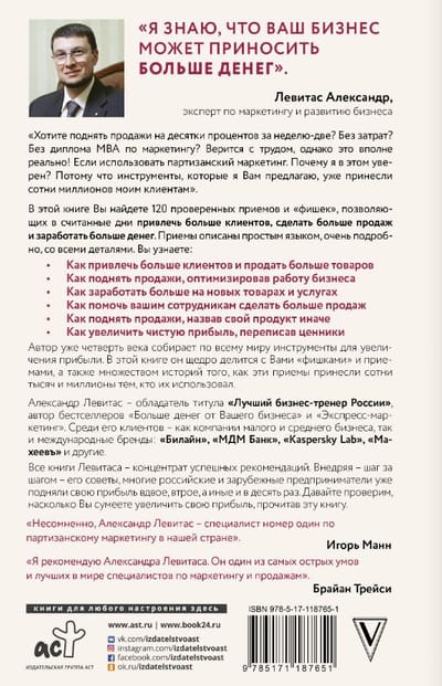 В этой книге Вы найдете 120 проверенных приемов и «фишек», позволяющих в считанные дни привлечь больше клиентов, сделать больше продаж и заработать больше денег. Приемы описаны простым языком, очень подробно, со всеми деталями. Вы узнаете: