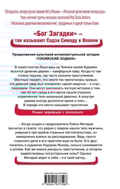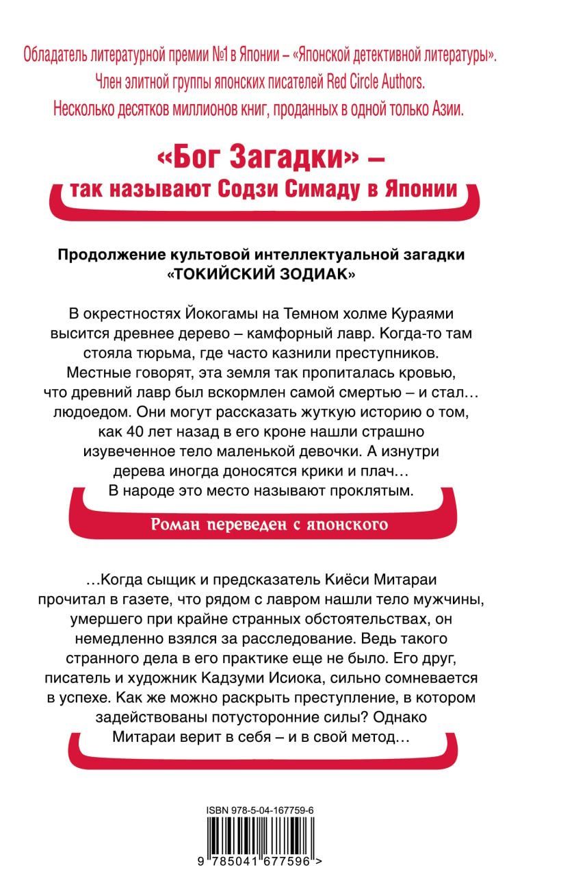 Сложно представить себе нечто более кошмарное и пугающее, чем то, что случилось осенью 1984 года. Этот страшный инцидент на Темном холме в Йокогаме, потряс всю Японию… В окрестностях Йокогамы на Темном холме Кураями высится древнее дерево – камфорный лавр. Когда-то там стояла тюрьма, где часто казнили преступников. Местные говорят, эта земля так пропиталась кровью, что древний лавр был вскормлен самой смертью – и стал… людоедом. Они могут рассказать жуткую историю о том, как 40 лет назад в его кроне нашли страшно изувеченное тело маленькой девочки. А изнутри дерева иногда доносятся крики и плач… В народе это место называют проклятым. …Когда сыщик и предсказатель Киёси Митараи прочитал в газете, что рядом с лавром нашли тело мужчины, умершего при крайне странных обстоятельствах, он немедленно взялся за расследование. Ведь такого странного дела в его практике еще не было. Его друг, писатель и художник Кадзуми Исиока, сильно сомневается в успехе. Как же можно раскрыть преступление, в котором задействованы потусторонние силы? Однако Митараи верит в себя – и в свой метод…