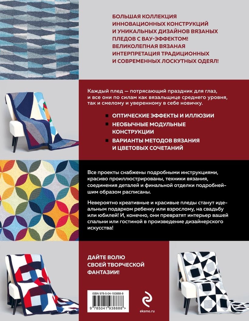 Каждый плед, который вы свяжете по этой книге, — потрясающий праздник для глаз, и все они по силам как вязальщице среднего уровня, так и смелому, уверенному в себе новичку. Вяжете вы их точно так же, как предлагает автор, либо подбираете цвета пряжи под дизайн своего интерьера, результат будет сногсшибательный! - Оптические эффекты и иллюзии. - Необычные модульные конструкции. - Варианты методов вязания и цветовых сочетаний. Все проекты снабжены подробными инструкциями, красиво проиллюстрированы, техники вязания, соединения деталей и финальной отделки подробнейшим образом расписаны. Некоторые пледы можно вязать разными способами, в этом случае даны инструкции на все варианты, и вы можете выбрать тот метод вязания, который вам нравится. Пряжа, подходящая для таких роскошных пледов, доступна по цене, ее легко найти в магазинах. Невероятно креативные и красивые пледы станут идеальным подарком ребенку или взрослому на свадьбу или юбилей! И, конечно, они превратят интерьер вашей спальни или гостиной в произведение дизайнерского искусства! Дайте волю своей творческой фантазии!