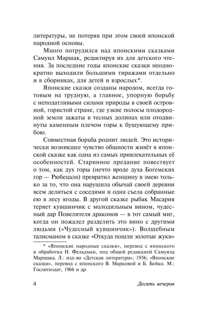 Свое название «Десять вечеров» сборник получил от необычной традиции: в Японии сказки всегда были отдыхом после тяжелого трудового дня, и что может быть лучше, чем греться вечером у очага и слушать чудесные и забавные истории.