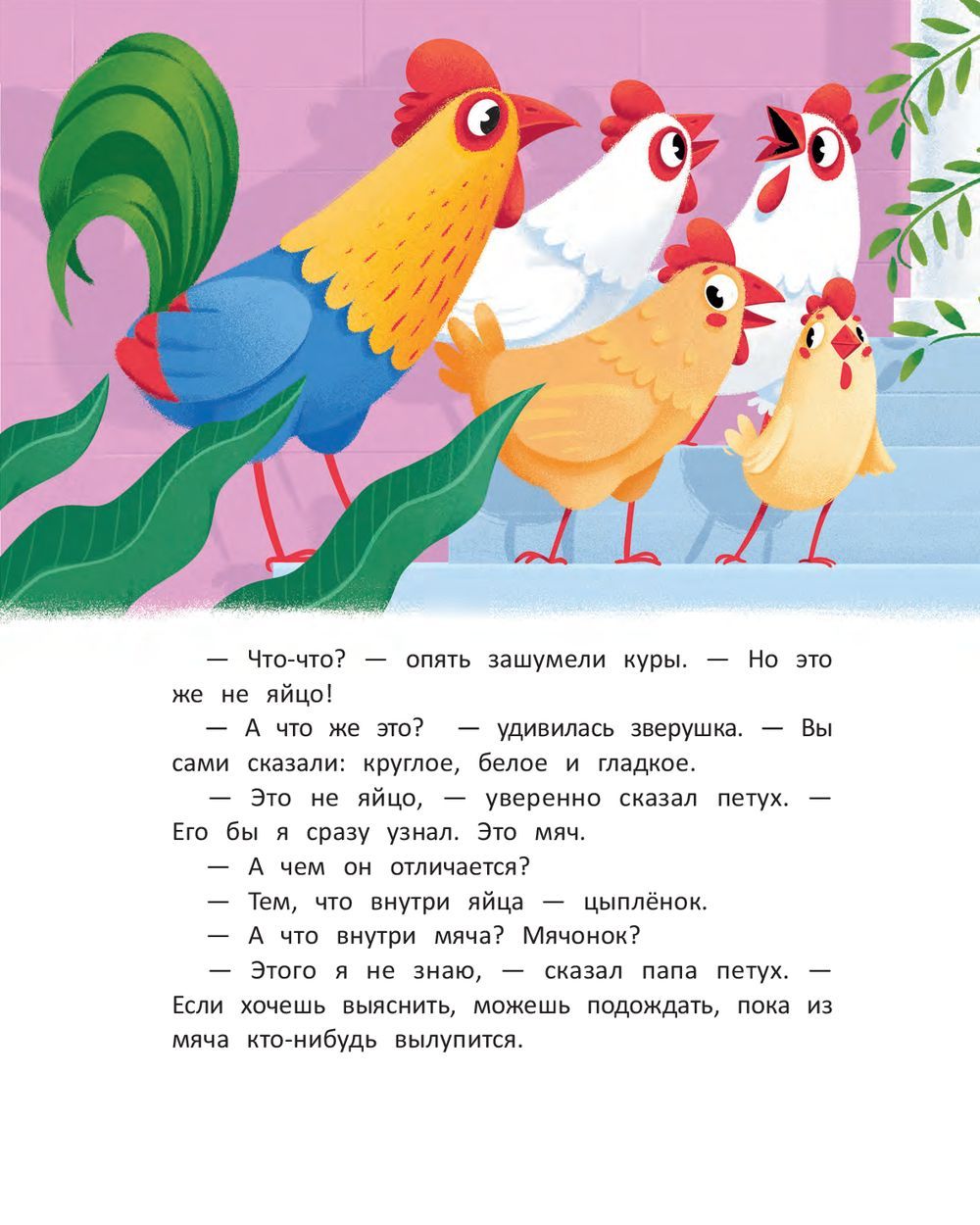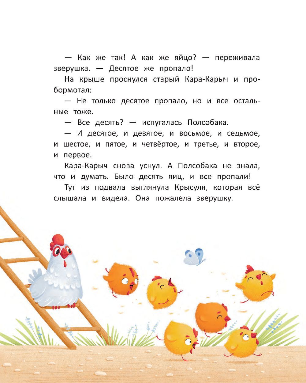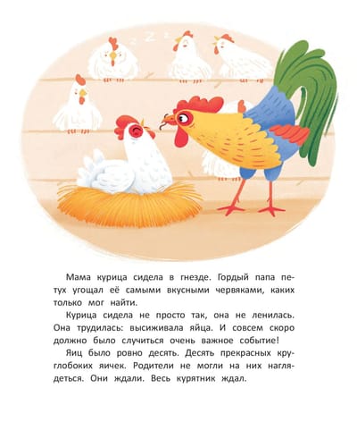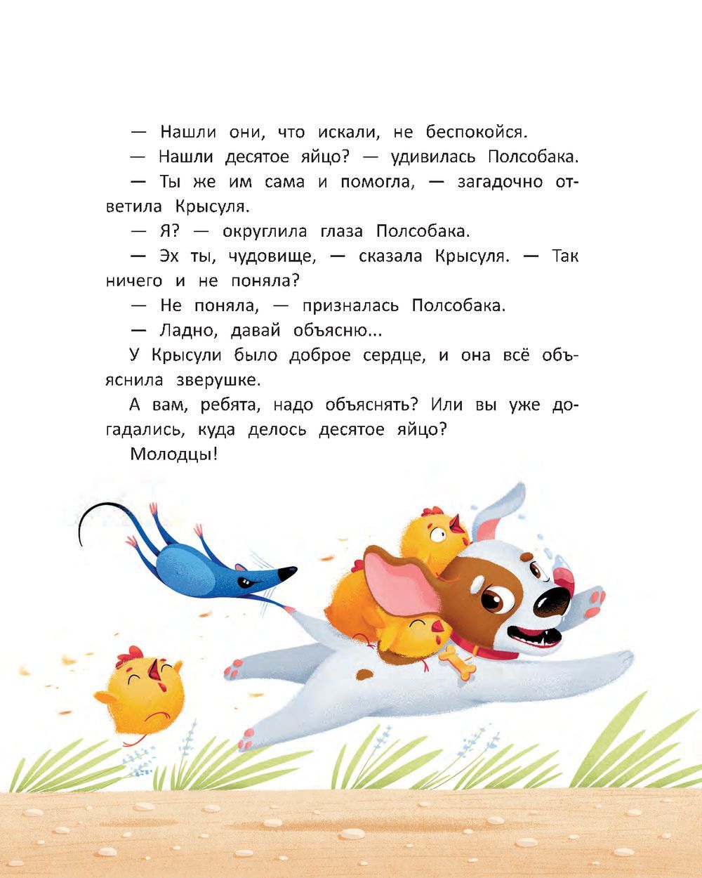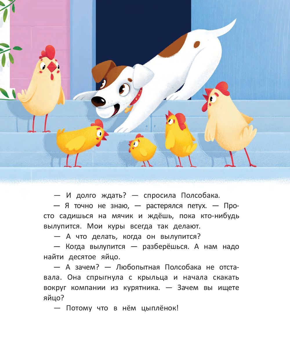 Однажды утром мама курица обнаруживает пропажу: исчезло десятое яйцо! Папа петух отправляется расследовать кражу в компании пяти пожилых кур, четырёх молодых, трёх старших цыплят, двух средних и одного совсем маленького. Куда приведёт их поиск?