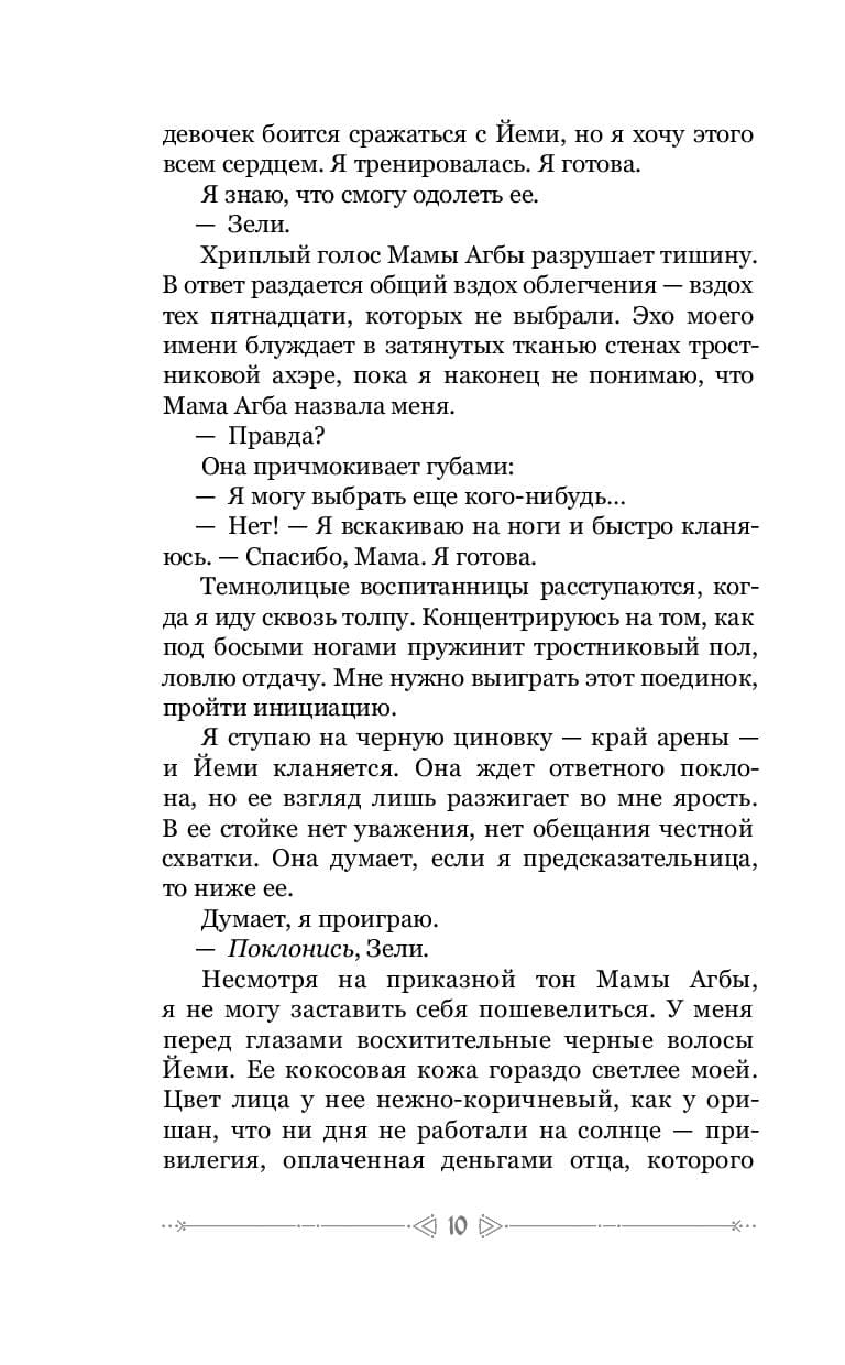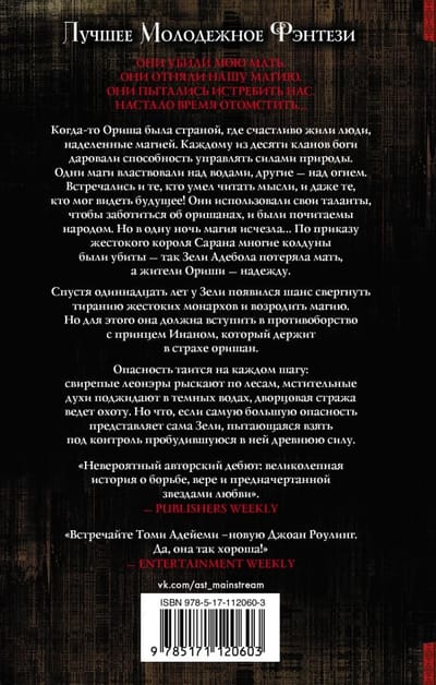 Когда‑то Ориша была страной, где счастливо жили люди, наделенные магией. Каждому из десяти кланов боги даровали способность управлять силами природы. Одни маги властвовали над водами, другие — над огнем. Встречались и те, кто умел читать мысли, и даже те, кто мог видеть будущее! Они использовали свои таланты, чтобы заботиться об оришанах, и были почитаемы народом. Но в одну ночь магия исчезла... По приказу жестокого короля Сарана многие колдуны были убиты — так Зели Адебола потеряла мать, а жители Ориши — надежду.
