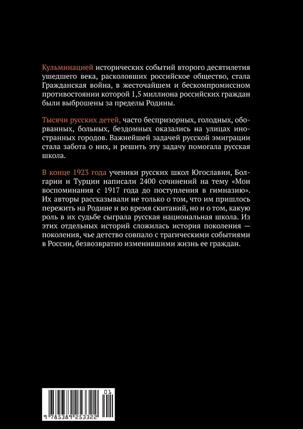 С конца 1923 года ученики русских школ Югославии, Болгарии и Турции написали 2400 сочинений на тему «Мои воспоминания с 1917 года до поступления в гимназию». Их авторы рассказывали не только о том, что им пришлось пережить на Родине и во время скитаний, но и о том, какую роль в их судьбе сыграла русская национальная школа. Из этих отдельных историй сложилась история поколения, - поколения, чье детство совпало с трагическими событиями в России, безвозвратно изменившими жизнь ее граждан.