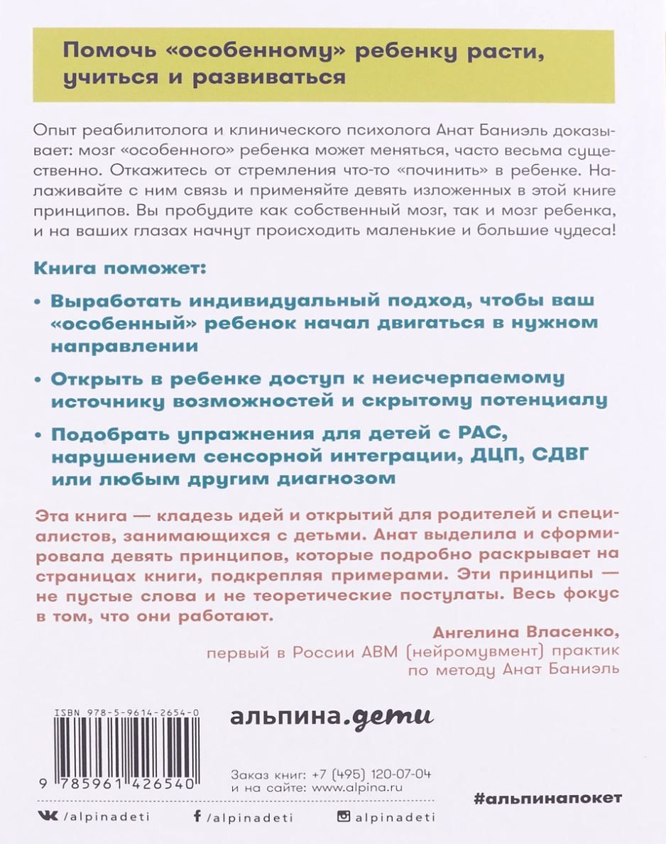 Нарушения работы мозга, с которыми часто связаны такие заболевания, как ДЦП, аутизм и различные генетические заболевания, можно скорректировать. Анат Баниэль, клинический психолог и автор уникальной методики реабилитации особых детей "АБМ", уверена, что неизлечимых детей не бывает, главное - индивидуальный подход и регулярность. Разобравшись в основных принципах пластичности мозга и методик реабилитации, которым обучает Анат Баниэль, родители смогут в сотрудничестве с врачами, физиотерапевтами, а также работая с ребенком самостоятельно, помогать ему выстраивать новую структуру мозга, а в итоге повысить качество жизни и адаптироваться в обществе вопреки безнадежным диагнозам. Неизлечимых детей нет, считает Анат Баниэль, главное — индивидуальный подход, регулярные занятия и понимание огромных возможностей пластичного мозга человека. Опираясь на девять принципов, которые лежат в основе метода "АБМ", вы сможете самостоятельно понять, что полезно именно вашему ребенку на пути восстановления, и поможет выбрать: специалистов по реабилитации; необходимые процедуры и правильное время для их проведения; самые эффективные упражнения для вашего ребенка. Отказываясь от стремления что-то "починить" в ребенке, вместо этого налаживая с ним связь и применяя девять изложенных в этой книге принципов, вы пробудите как собственный мозг, так и мозг ребенка, и на ваших глазах начнут происходить маленькие и большие чудеса. Понаблюдайте за реальными уроками автора с самыми разными маленькими пациентами. Получите практические советы по взаимодействию и занятиям с ребенком дома. Узнайте о самых последних разработках ведущих нейроученых мира. Зинтересует родителей, которые хотят помочь ребенку адаптироваться в обществе вопреки безнадежным диагнозам.