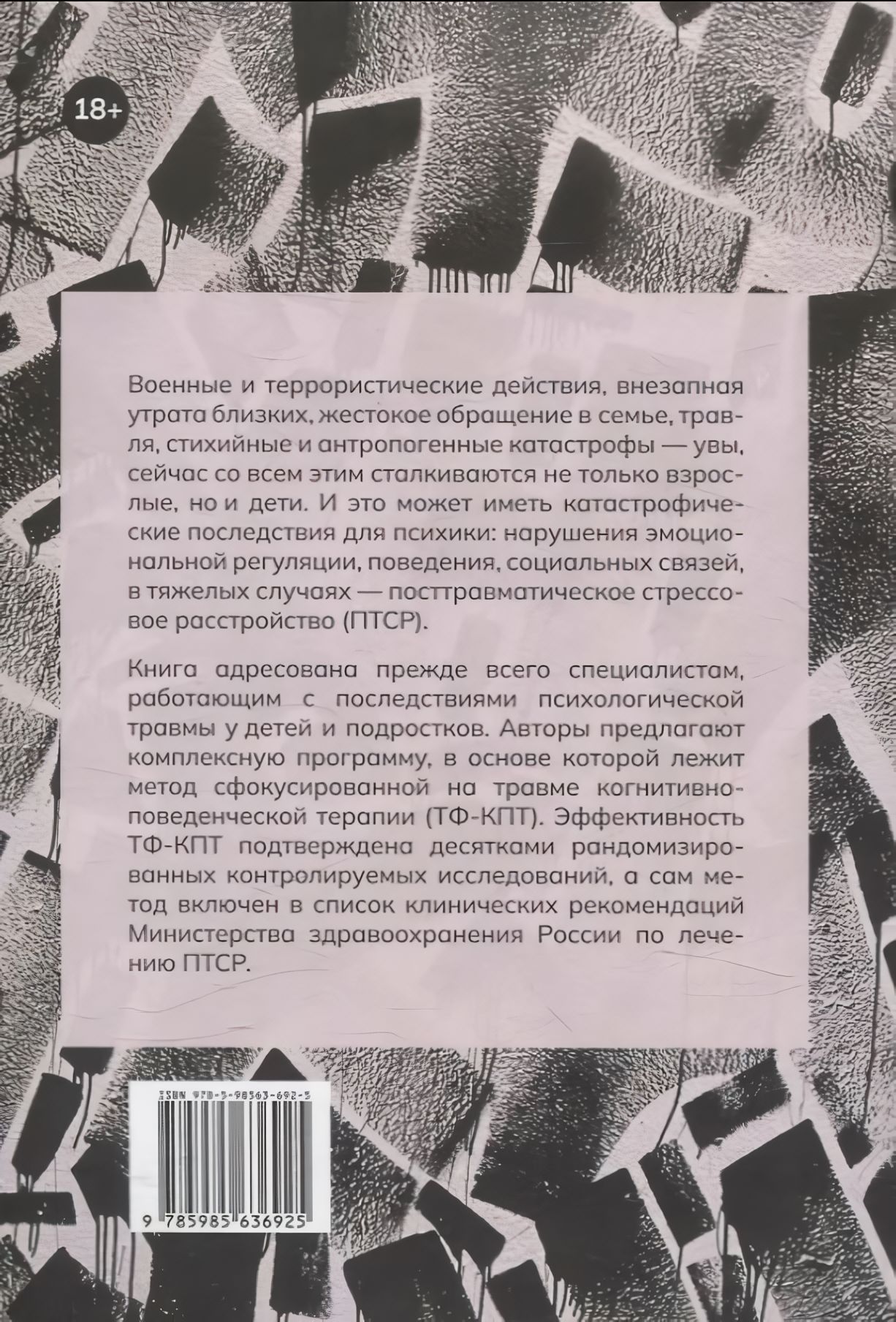 В книге представлена терапевтическая модель работы с детьми и подростками, пережившими травмирующий опыт. Речь идет о тех ситуациях, в которых ребенок непосредственно переживает или наблюдает нечто, связанное с фактом или угрозой смерти, с серьезными физическими травмами или насилием любого рода. В большинстве случаев травма проявляется в виде эмоциональных, поведенческих и других проблем. Метод, которым предлагают воспользоваться авторы для помощи травмированным детям, получил название когнитивно-поведенческой терапии, сфокусированной на травме (ТФ-КПТ). В России его используют в том числе для работы с последствиями посттравматического стрессового расстройства (ПТСР).