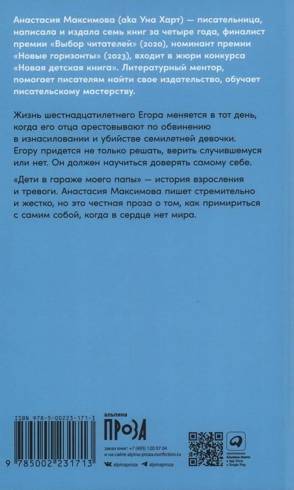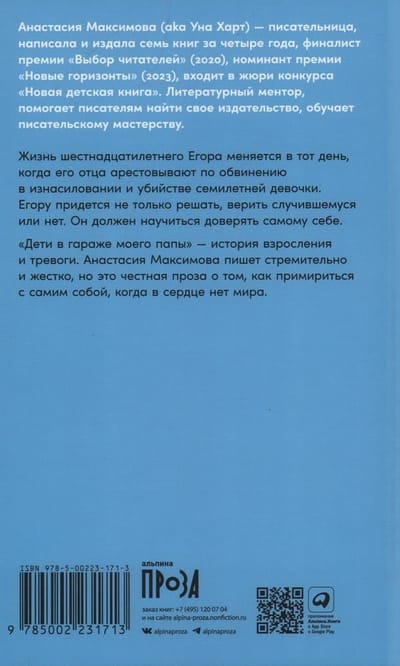 «Дети в гараже моего папы» — история взросления и тревоги. Анастасия Максимова пишет стремительно и жестко, но это честная проза о том, как примириться с самим собой, когда в сердце нет мира.