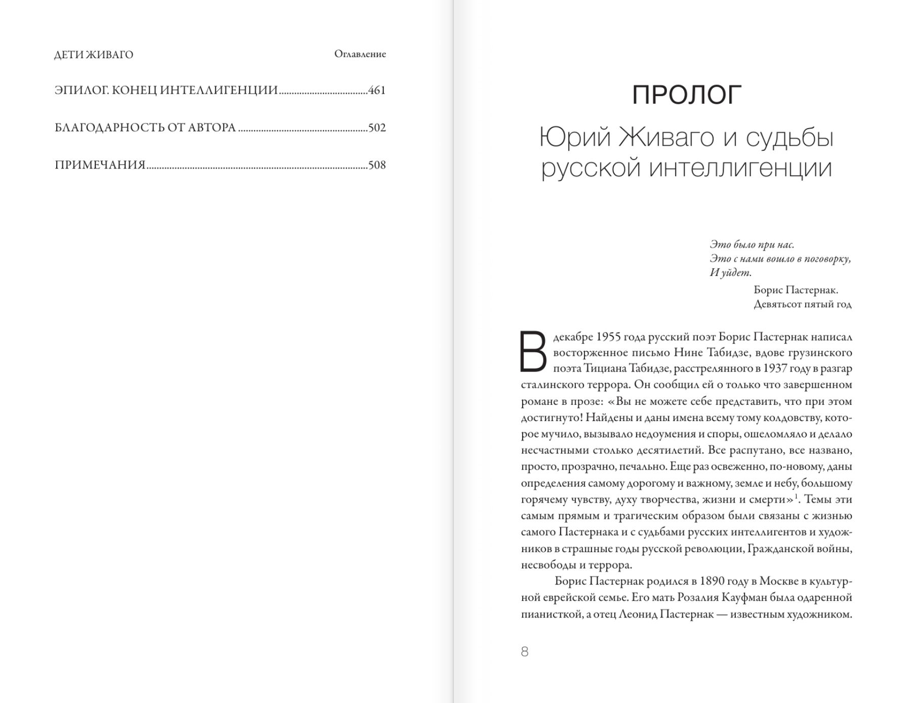 «Дети Живаго» — коллективная история людей, которые формировали культуру, мировоззрение и общественное мнение в России после смерти Сталина. Это не только знаменитые «шестидесятники», такие как Александр Твардовский, Евгений Евтушенко и Владимир Высоцкий, но также их старшие наставники — от Ильи Эренбурга до Дмитрия Лихачёва, диссиденты Андрей Сахаров и Александр Солженицын, физики и социологи, журналисты и кинематографисты, режиссёры и актёры театра, государственные и партийные работники — все, кто видел себя наследниками русской интеллигенции.
