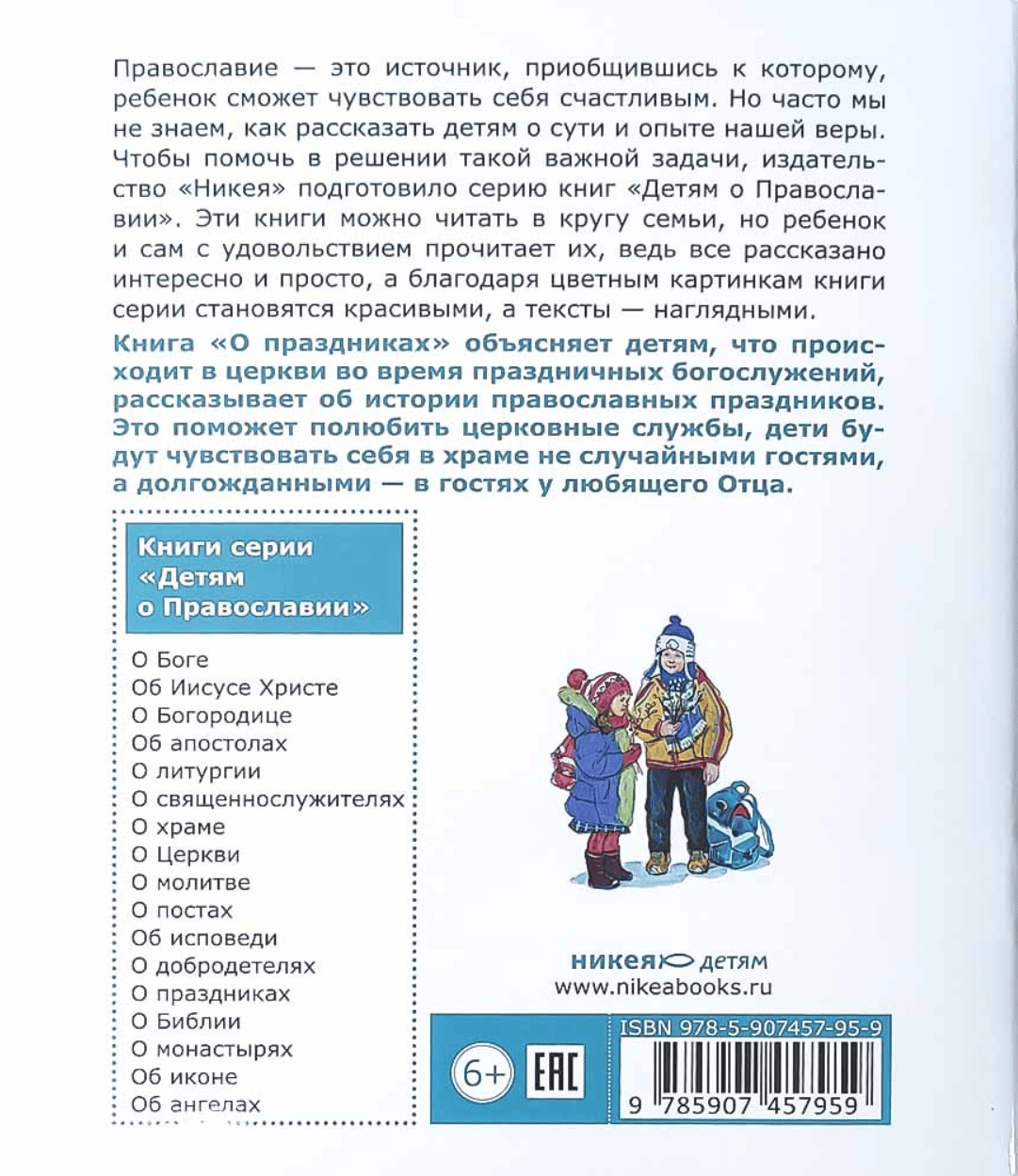 Книга «О праздниках» объясняет детям, что происходит в церкви во время праздничных богослужений, рассказывает об истории православных праздников. Это поможет полюбить церковные службы, дети будут чувствовать себя в храме не случайными гостями, а долгожданными — в гостях у любящего Отца.