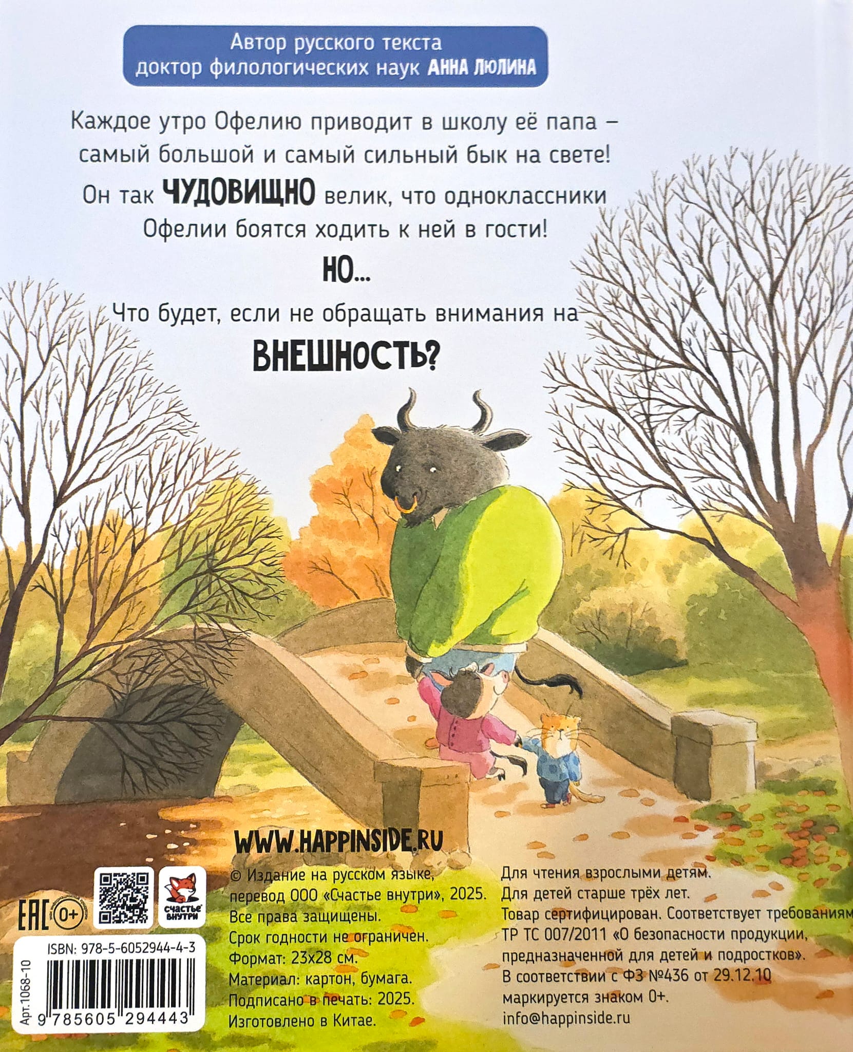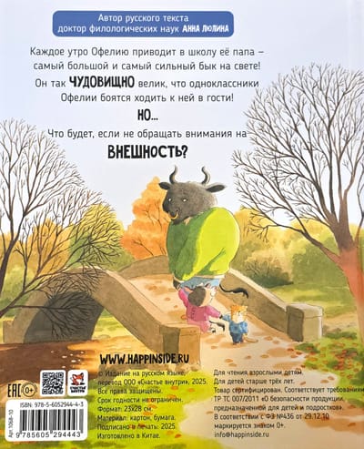 Каждое утро Офелию приводит в школу её папа – самый большой и сильный бык на свете! Он так чудовищно велик, что одноклассники Офелии боятся ходить к ней в гости! Но... Что будет, если не обращать внимания на внешность? Эта захватывающая история в стихах предназначена для детей от 3 лет и идеально подходит для совместного чтения перед сном.