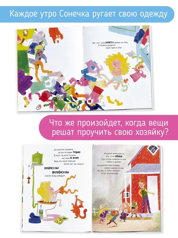 Каждое утро Сонечка ругает свою одежду. Она совсем не любит ее надевать! Однажды платьица, юбочки, брючки и все-все-все остальные вещи очень обиделись на хозяйку. Ведь девчушка очень плохо обращается с ними! Что будет, если они решат проучить Сонечку?