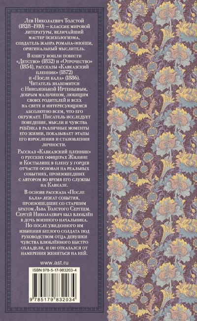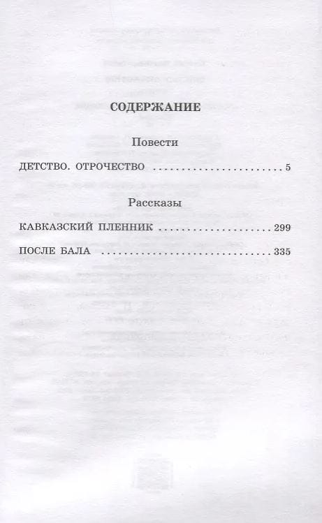 В книгу вошли повести «Детство» (1852) и «Отрочество» (1854), рассказы «Кавказский пленник» (1872) и «После бала» (1886).