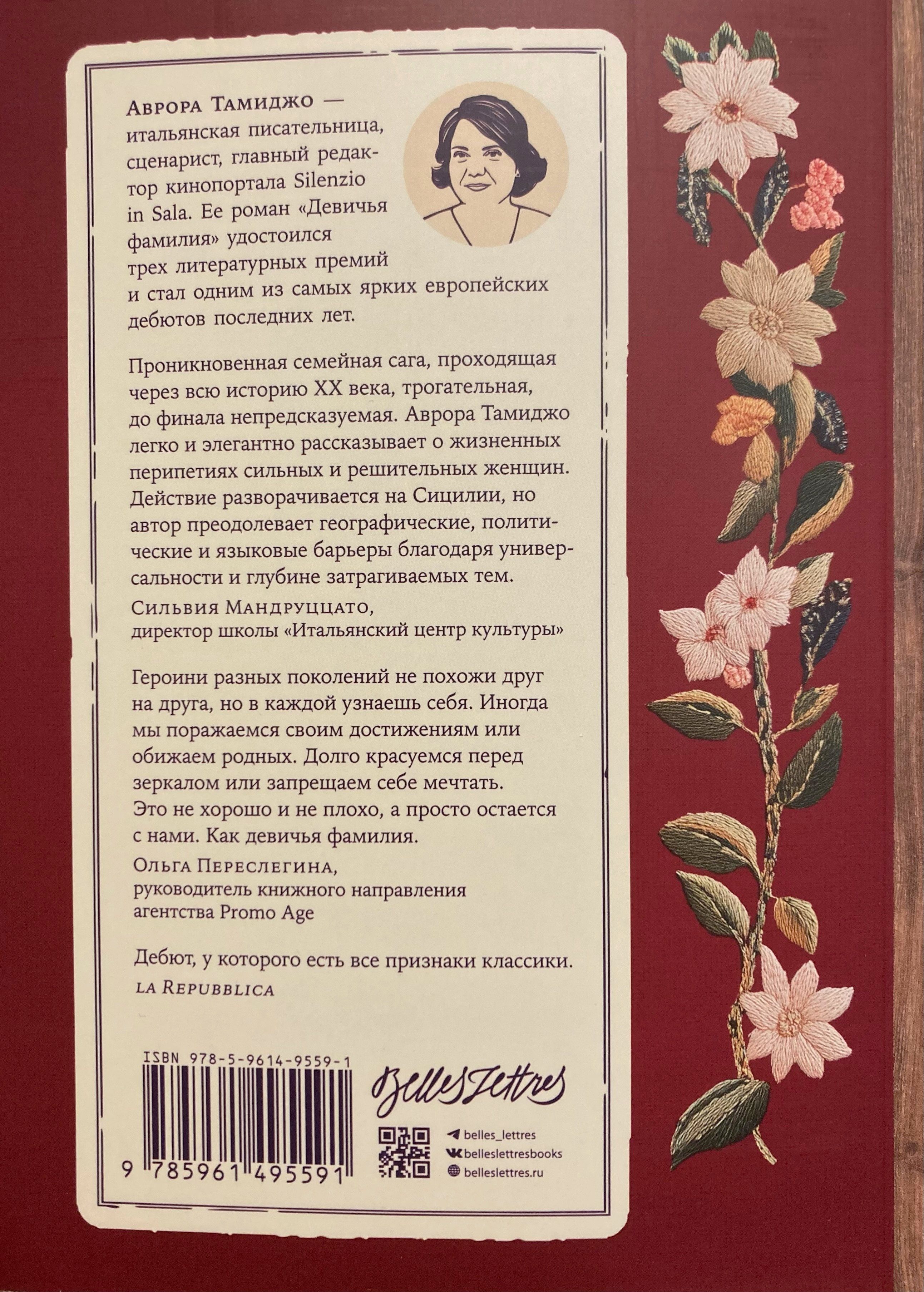 Итальянские критики называют дебютный роман Авроры Тамиджо «"Сто лет одиночества" с женским лицом», ставя его в один ряд с «Семейным лексиконом» Наталии Гинзбург и прозой Грации Деледды. От патриархальных 1920-х до бурных 1980-х, от безмолвного согласия к обретению голоса — в этой хронике женской силы и солидарности сохранение девичьей фамилии становится символом свободы.