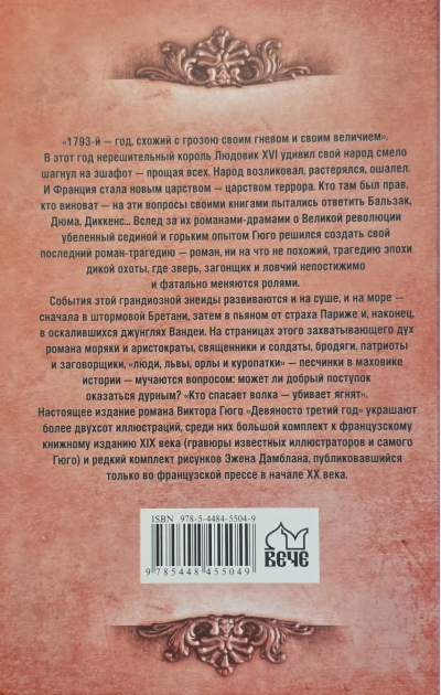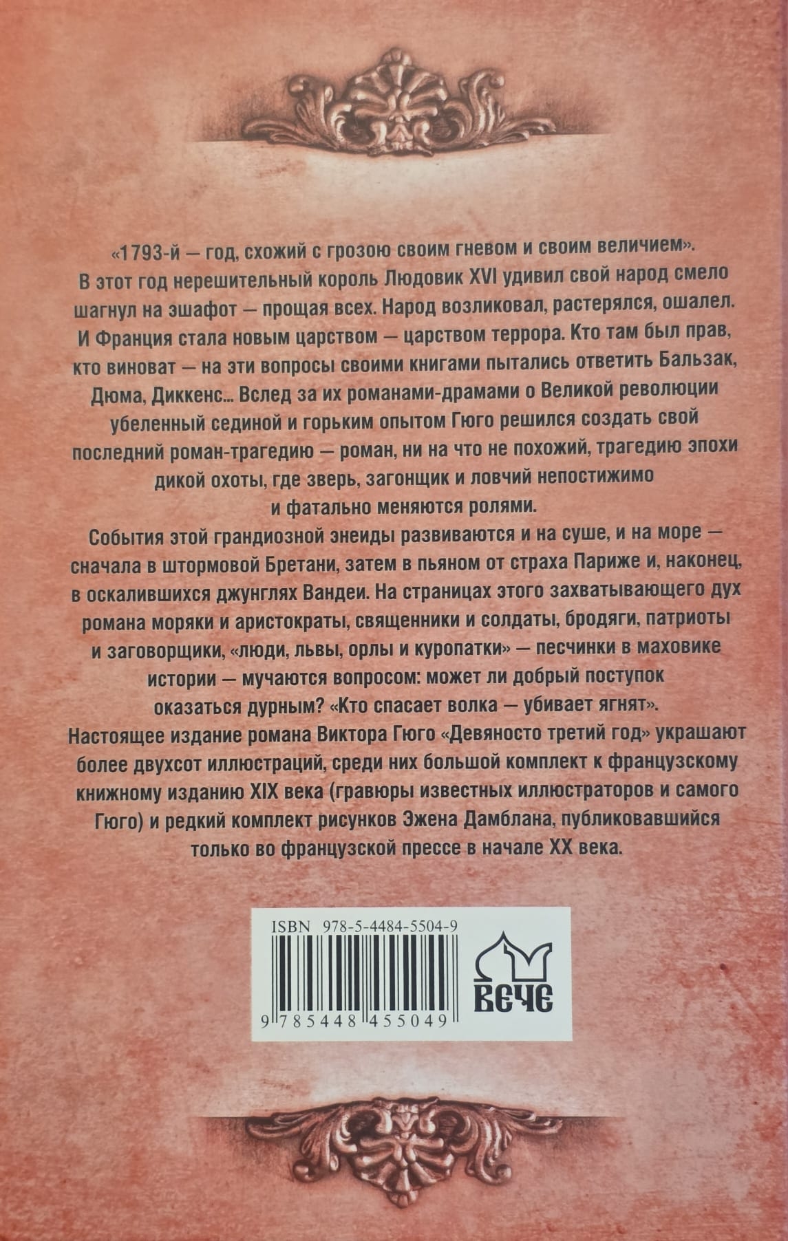 Настоящее издание романа Виктора Гюго «Девяносто третий год» украшают более двухсот иллюстраций, среди них большой комплект к французскому книжному изданию XIX века (гравюры известных иллюстраторов и самого Гюго) и редкий комплект рисунков Эжена Дамблана, публиковавшийся только во французской прессе в начале XX века.