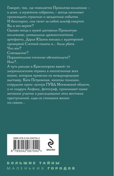 Говорят, там где появляется Проклятая коллекция — в доме, в музейном собрании, — всегда начинают происходить странные и загадочные события. И, бесспорно, она тянет за собой шлейф смертей. Вы в это верите? Однако, когда в музей доставили Проклятую коллекцию, уникальные древнеегипетские артефакты, Дарья Юдина явилась с аудиторской проверкой Счетной палаты и… была убита. Что это? Совпадение? Поразительное стечение обстоятельств? Или?.. А чуть раньше в Красногорске какой-то злоумышленник отравил в зоогостинице всех кошек, которых привезли на международную выставку.