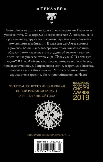 Алекс Стерн не похожа на других первокурсников Йельского университета. Она выросла на задворках Лос-Анджелеса, рано бросила школу, дружила с плохими парнями и перебивалась случайными заработками. В двадцать лет Алекс выжила в ужасной бойне – и благодаря этой трагедии загадочным образом получила шанс стать студенткой одного из самых престижных университетов мира. Почему она? И в чем тут подвох? В Нью-Хейвене к вопросам, которые терзают Алекс, прибавляются новые. Запрещенная магия, секретные общества, порочная элита Лиги плюща… Что за страшные тайны скрываются в древних, благопристойных стенах Йеля?