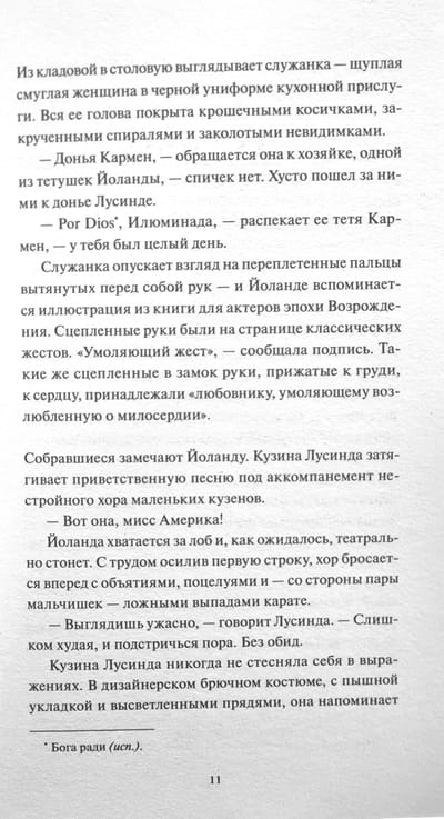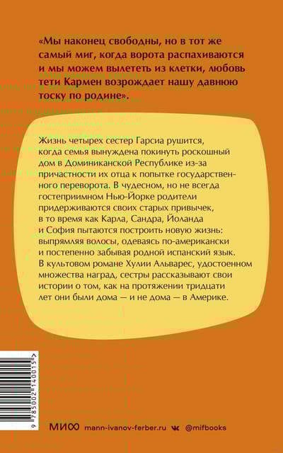 В чудесном, но не всегда гостеприимном Нью-Йорке родители придерживаются своих старых привычек, в то время как Карла, Сандра, Йоланда и София пытаются построить новую жизнь: выпрямляя волосы, одеваясь по-американски и постепенно забывая родной испанский язык. В культовом романе Хулии Альварес, удостоенном множества наград, сестры рассказывают свои истории о том, как на протяжении тридцати лет они были дома – и не дома – в Америке.