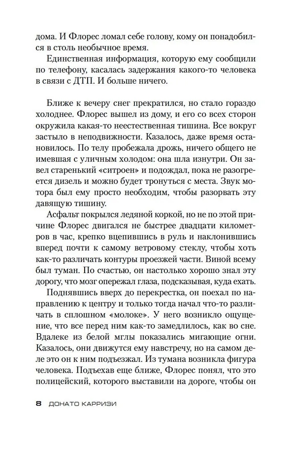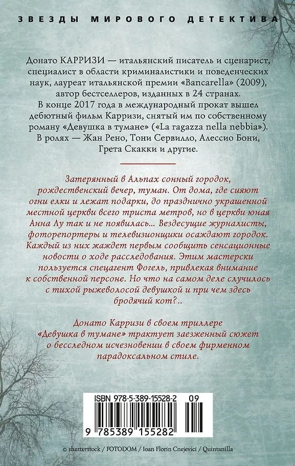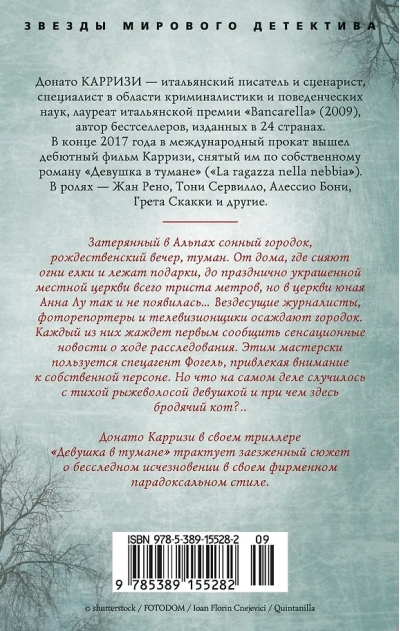 Затерянный в Альпах сонный городок, рождественский вечер, туман. От дома, где сияют огни елки и лежат подарки, до празднично украшенной местной церкви, всего триста метров, но в церкви юная Анна Лу так и не появилась… Вездесущие журналисты, фоторепортеры и телевизионщики осаждают городок. Каждый из них жаждет первым сообщить сенсационные новости о ходе расследования. Этим мастерски пользуется спецагент Фогель, привлекая внимание к собственной персоне. Но что на самом деле случилось с тихой рыжеволосой девушкой и причем здесь бродячий кот?.. Донато Карризи в триллере «Девушка в тумане» трактует расхожий сюжет с бесследным исчезновением в своем фирменном парадоксальном стиле.