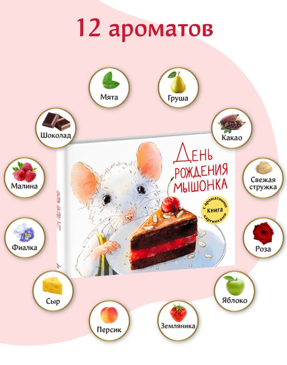 У мышонка сегодня день рождения. Чтобы испечь праздничный торт, он отправляется в лавку за продуктами. Но по дороге то и дело встречает друзей, которым необходима его помощь. Лавка закрывается до прихода мышонка. Неужели в свой праздник он останется без угощения? Читай сказку, рассматривай картинки и вместе с мышонком наслаждайся ароматами груши, какао, свежей стружки, розы, яблока, земляники, персика, сыра, фиалки, малины, шоколада и мяты. Для этого надо просто потереть пальчиком самые большие картинки. Это ароматная книга для детей дошкольного возраста. Порадуй себя и своего ребенка книгой с запахами.