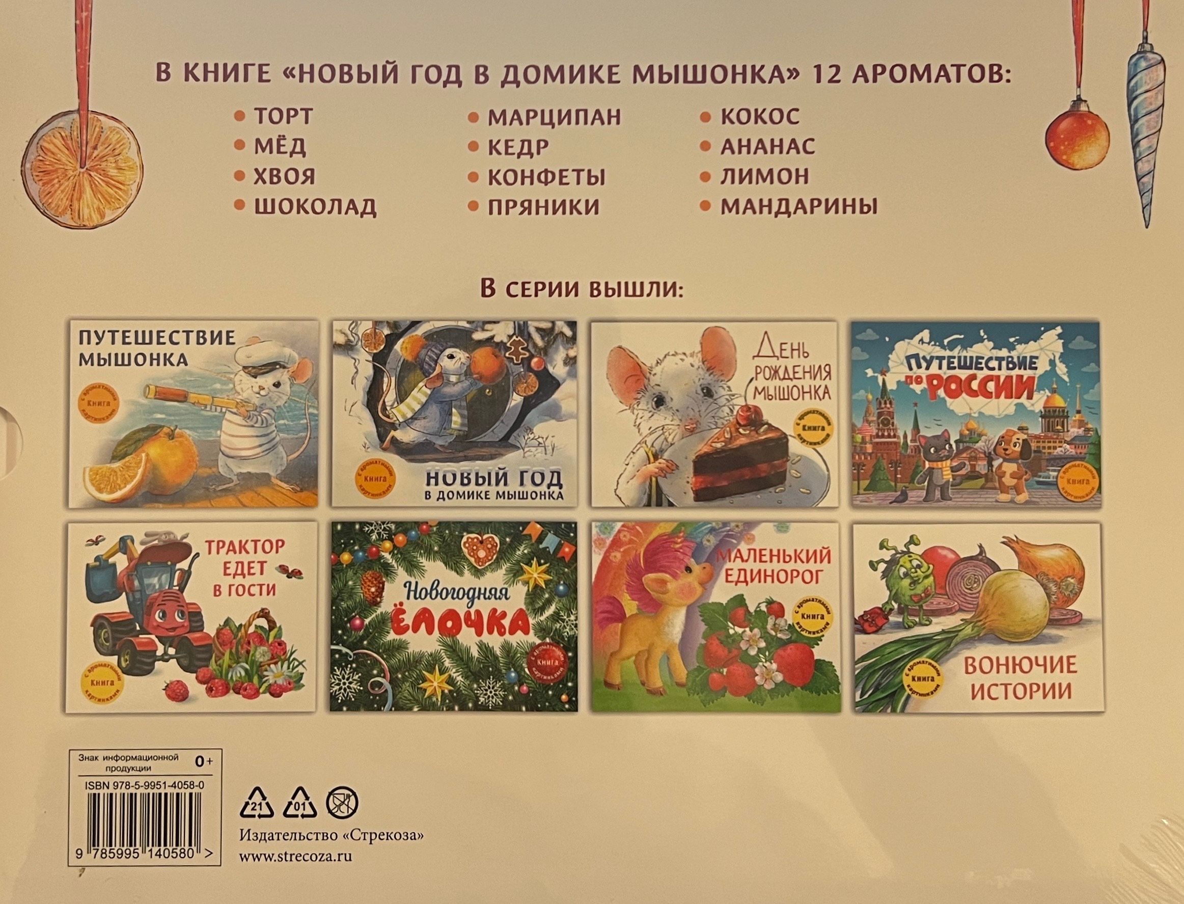 В этой книги 12 картинок с ароматами торта, меда, хвои, шоколада, марципана, кедра, конфет, пряники, кокоса, ананаса, лимона, мандаринов.