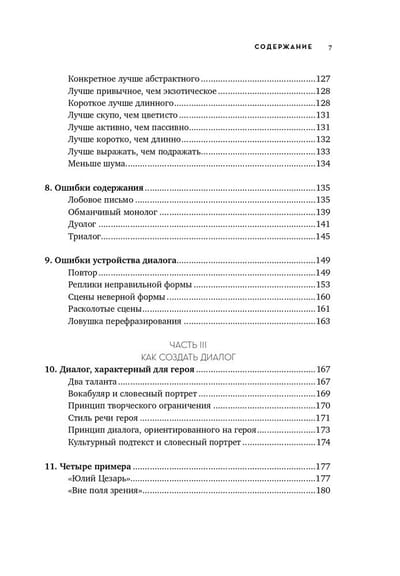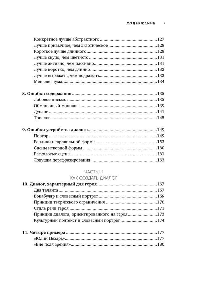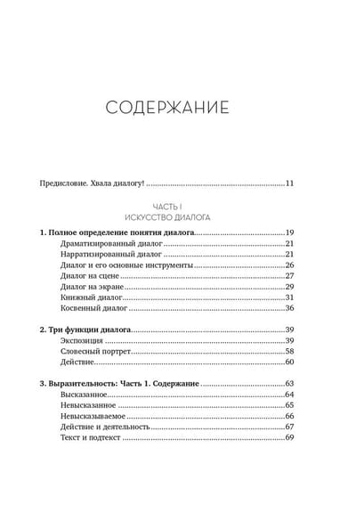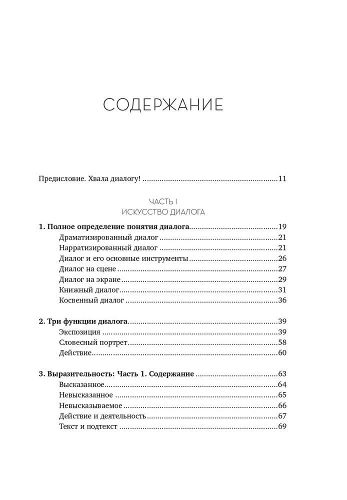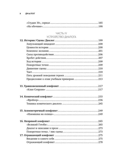 Книга поделена на 4 части, каждая из которых поэтапно приближает читателя к совершенству в искусстве ведения диалога. Роберт Макки обращается к различным определениям понятия «диалог» и рассматривает каждое из них, поясняя теорию примерами из шедевров драматической прозы, фильмов и телепередач. Через эти цитаты он демонстрирует два основных правила хорошего диалога: первое - каждый обмен репликами в диалоге создает действие и противодействие, двигающие сцену; и второе - хотя действия находят выражение во внешних проявлениях или в речи, источник действий персонажа невидим и скрывается в подтексте.