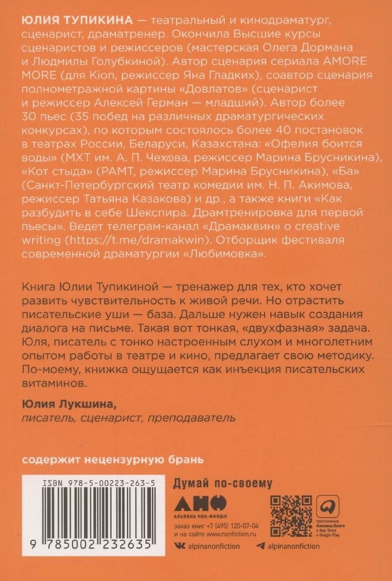 Драматург, сценарист и преподаватель Юлия Тупикина в своей новой книге предлагает 15 глав — 15 инструментов, позволяющих превратить обмен репликами в нечто большее. Разбирая многочисленные примеры, автор показывает, какими способами достигаются глубина, объем, подтекст речи, как в беседе раскрываются характеры персонажей и особенности их взаимоотношений, как работают контрасты высокого и низкого, трагического и комического и за счет чего возникает доверие у читателя и зрителя. Книга «Диалоги — огонь!» поможет опытным и начинающих авторам настроить свою профессиональную оптику в деле создания выдающихся диалогов и даст обычному читателю и зрителю ключи к более глубокому пониманию фильмов, пьес и прозы.
