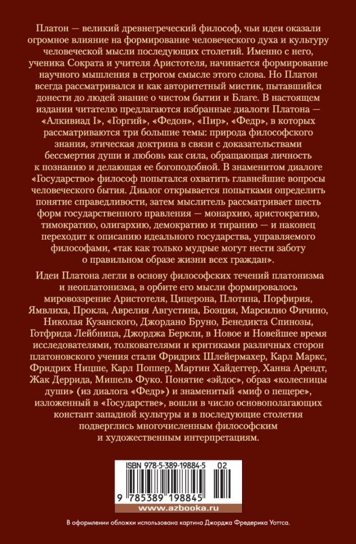 Платон — великий древнегреческий философ, чьи идеи оказали огромное влияние на формирование человеческого духа и культуру человеческой мысли последующих столетий. Именно с него, ученика Сократа и учителя Аристотеля, начинается формирование научного мышления в строгом смысле этого слова. Но Платон всегда рассматривался и как авторитетный мистик, пытавшийся донести до людей знание о чистом бытии и Благе. В настоящем издании читателю предлагаются избранные диалоги Платона — «Алкивиад I», «Горгий», «Федон», «Пир», «Федр», в которых рассматриваются три большие темы: природа философского знания, этическая доктрина в связи с доказательствами бессмертия души и любовь как сила, обращающая личность к познанию и делающая ее богоподобной. В знаменитом диалоге «Государство» философ попытался охватить главнейшие вопросы человеческого бытия. Диалог открывается попытками определить понятие справедливости, затем мыслитель рассматривает шесть форм государственного правления — монархию, аристократию, тимократию, олигархию, демократию и тиранию — и наконец переходит к описанию идеального государства, управляемого философами, «так как только мудрые могут нести заботу о правильном образе жизни всех граждан».