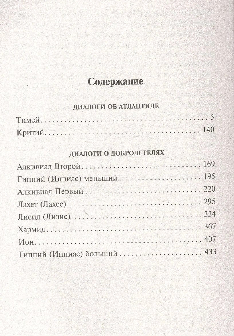 Что мы знаем об Атлантиде? И откуда вообще мы о ней узнали? Откуда возникла эта легенда и кто впервые рассказал о могущественном островном государстве, описал его особенности и попытку завоевать древнее государство афинян? Диалоги великого философа Платона «Тимей» и «Критий» - это единственный литературный источник, подробно рассказывающий нам об этом острове, где располагалось «удивительное по величине и могуществу царство» атлантов, погрязших в роскоши, алчности и гордыне и за это ввергнутых богами в морскую пучину. В состав предлагаемого сборника входят также диалоги, затрагивающие тему человеческих добродетелей.